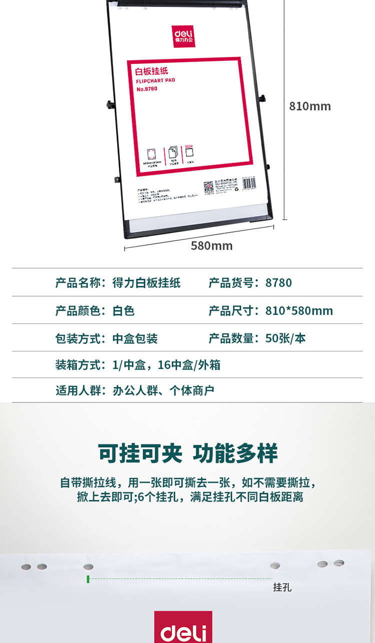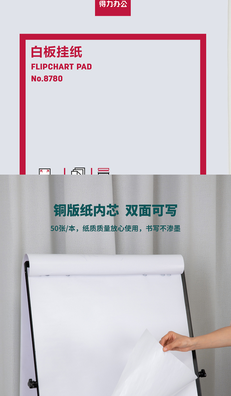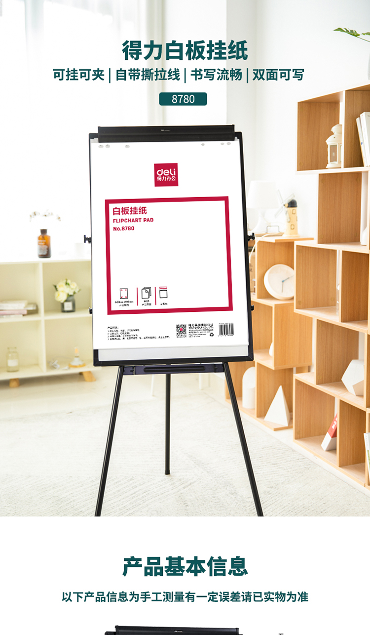 商品名称:得力8780白板挂纸810*580mm(50张/卷)(白色)(盒)