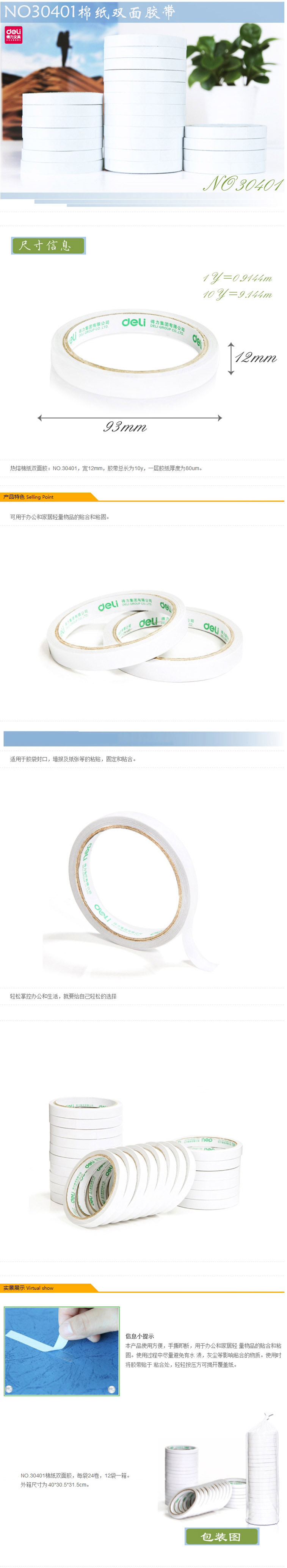 商品名称:得力(deli)高粘性棉纸双面胶带 12mm*10y(9.1m/卷) 30401(单位:卷)
