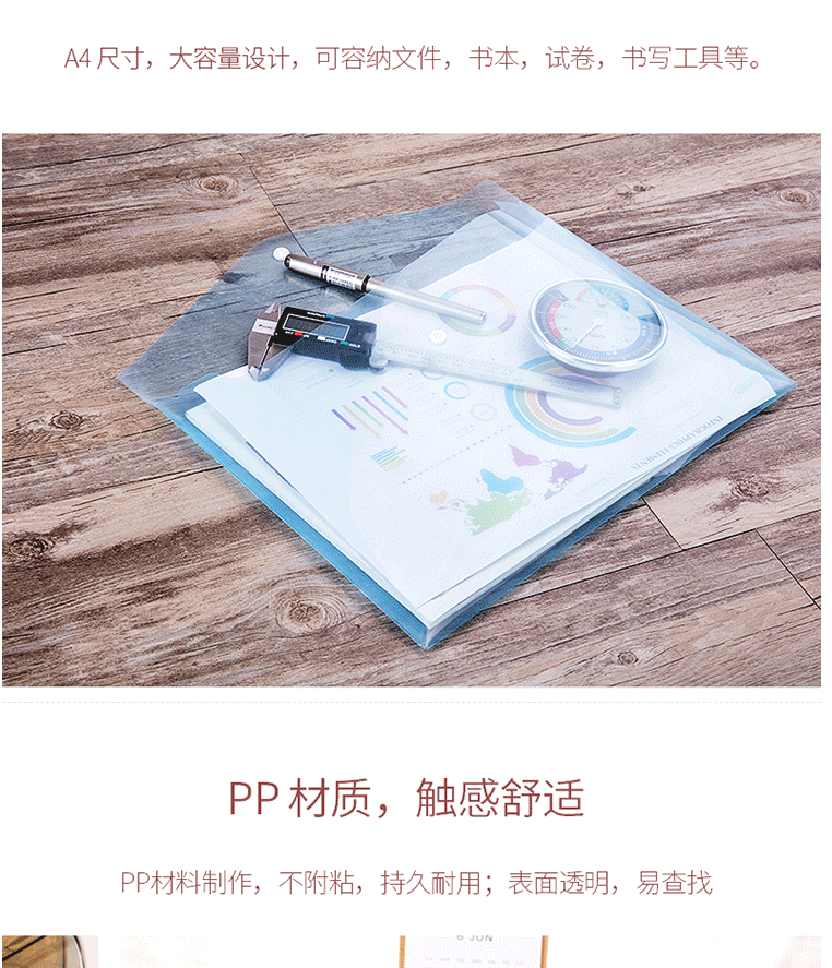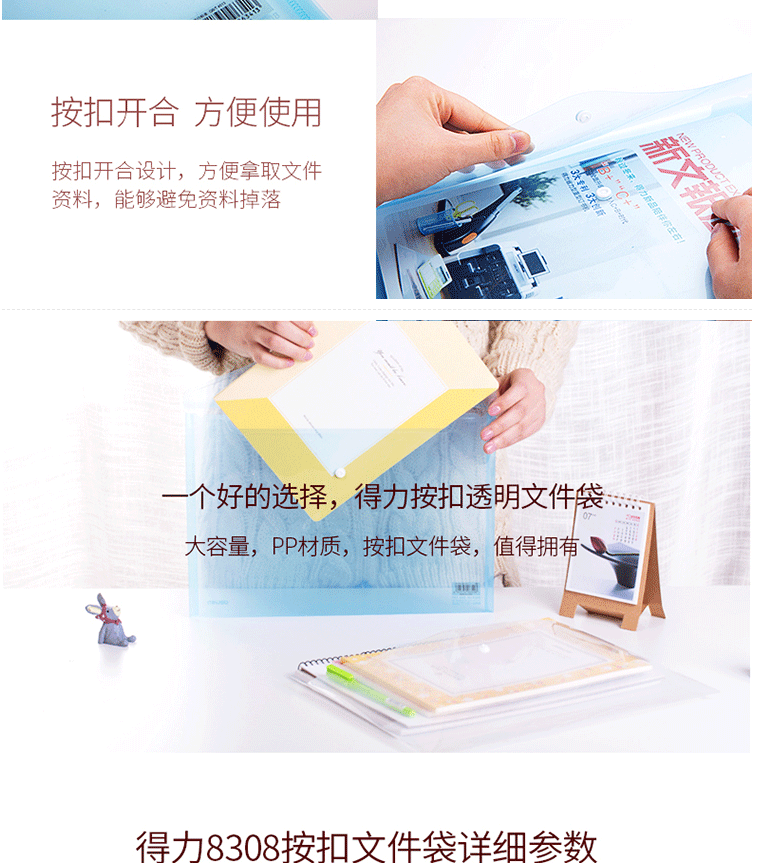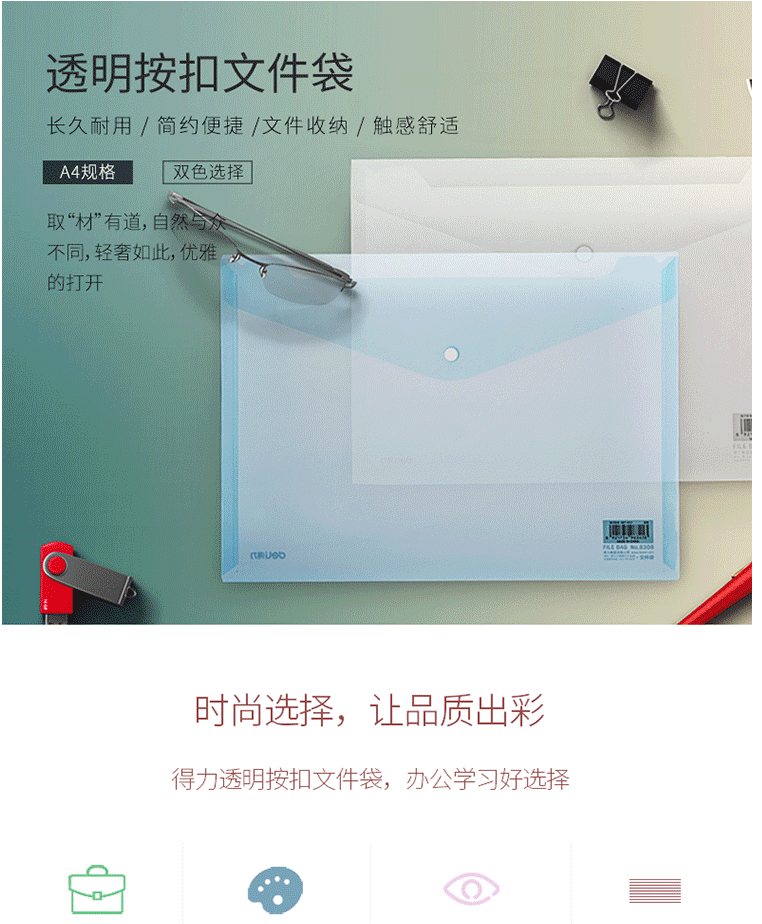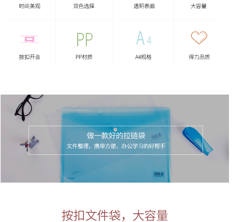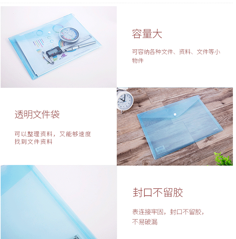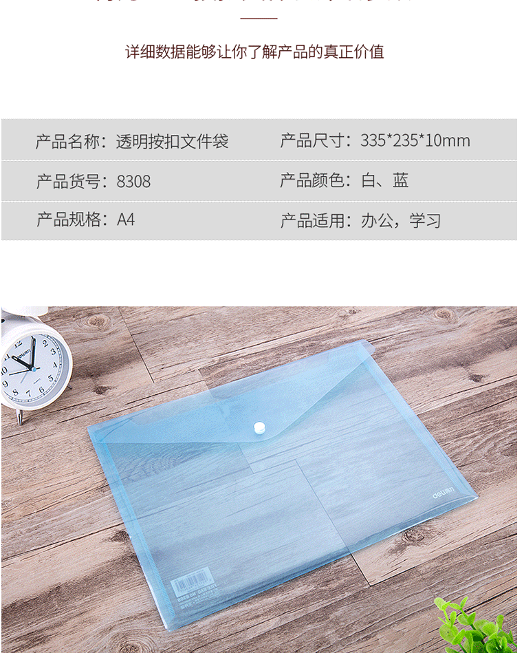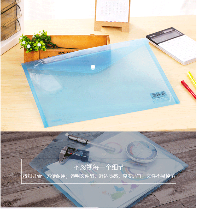 商品名称:得力(deli)A4透明文件袋 按扣资料袋 塑料档案袋 8308蓝