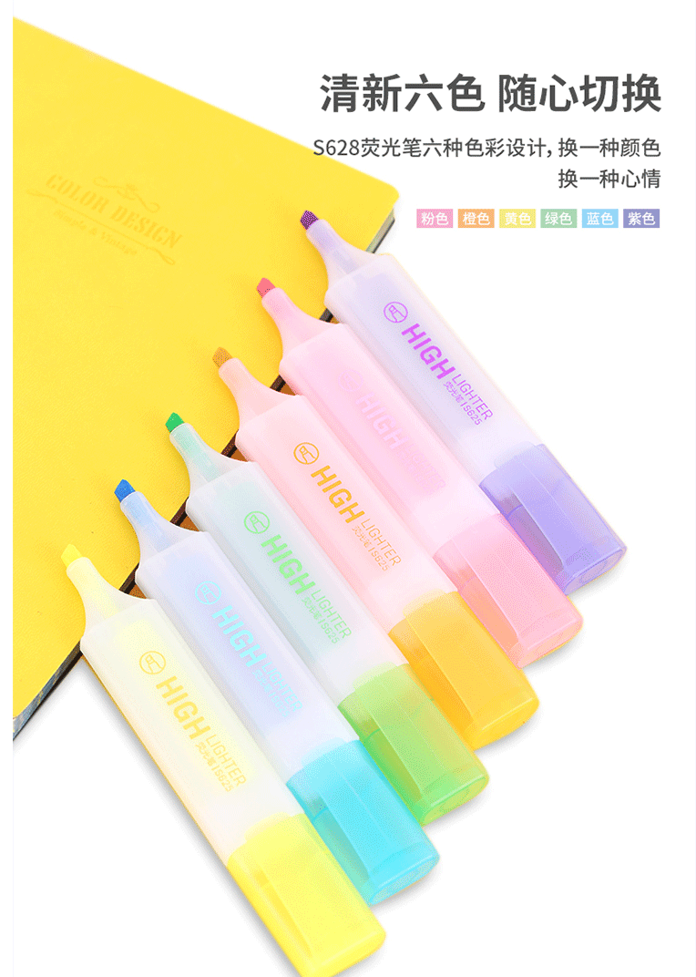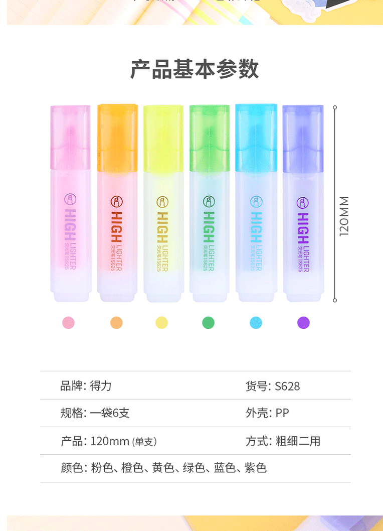 商品名称:得力(deli)6色荧光笔 重点醒目标记笔 水性彩色手帐用记号笔 S628 (6支/袋)