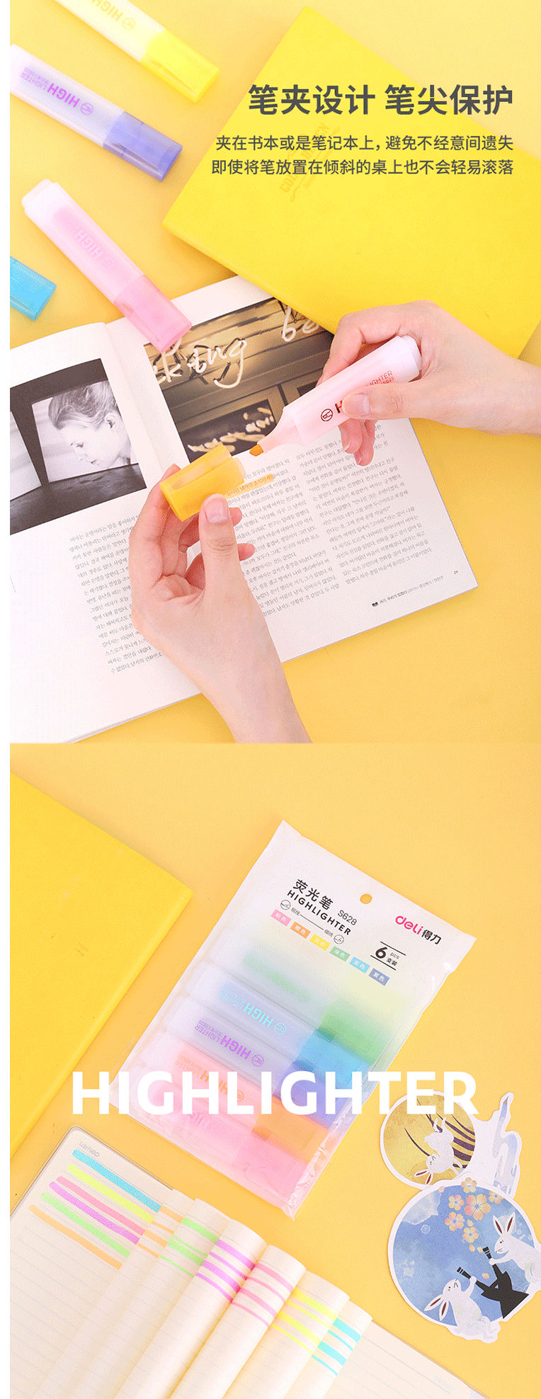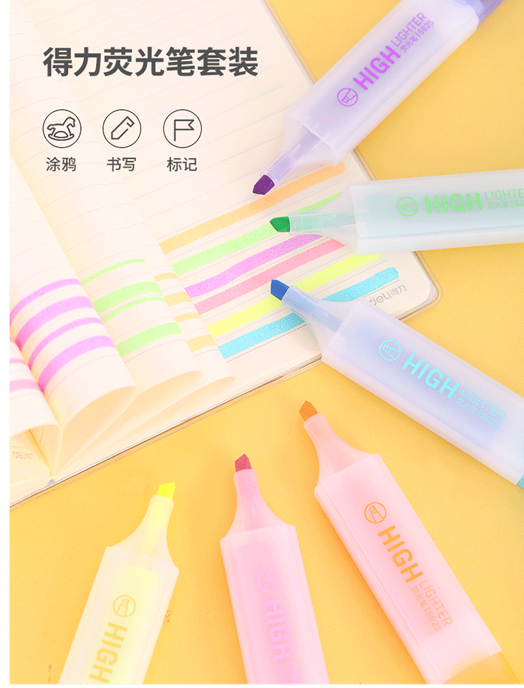 得力(deli)6色荧光笔 重点醒目标记笔 水性彩色手帐用记号笔 S628 (6支/袋)