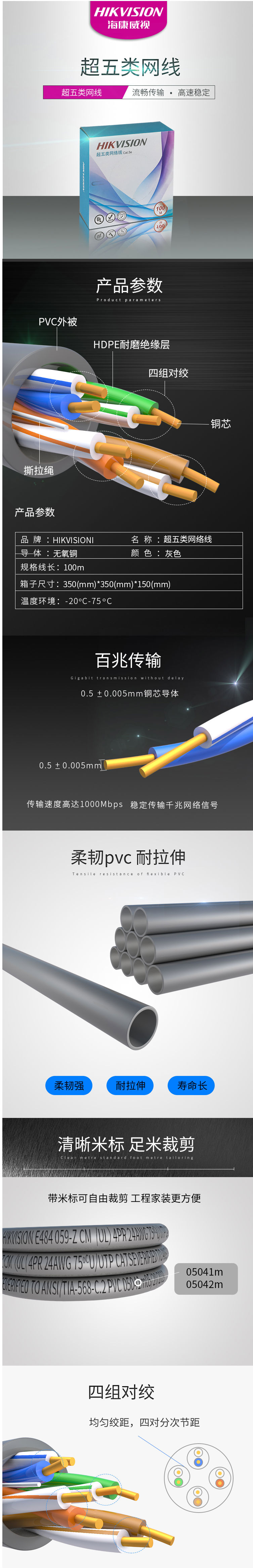 商品名称:海康威视超五类网线 工程级无氧铜箱线 0.5铜径非屏蔽双绞线 DS-1LN5E-S/E-100(100米/箱)