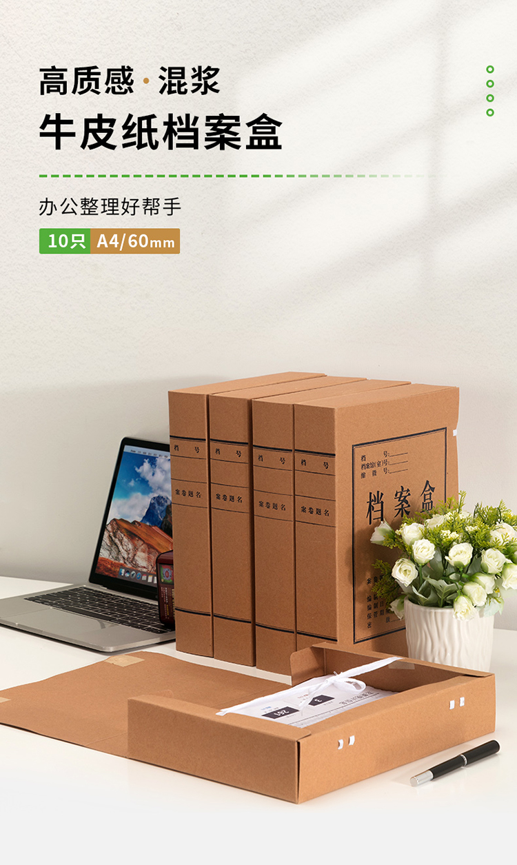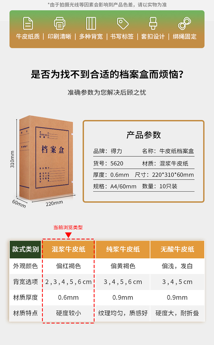 商品名称:得力(deli)60mm加宽高质感牛皮纸档案盒 党建资料盒 加厚文件收纳盒 财务凭证盒5620 (10只/组)