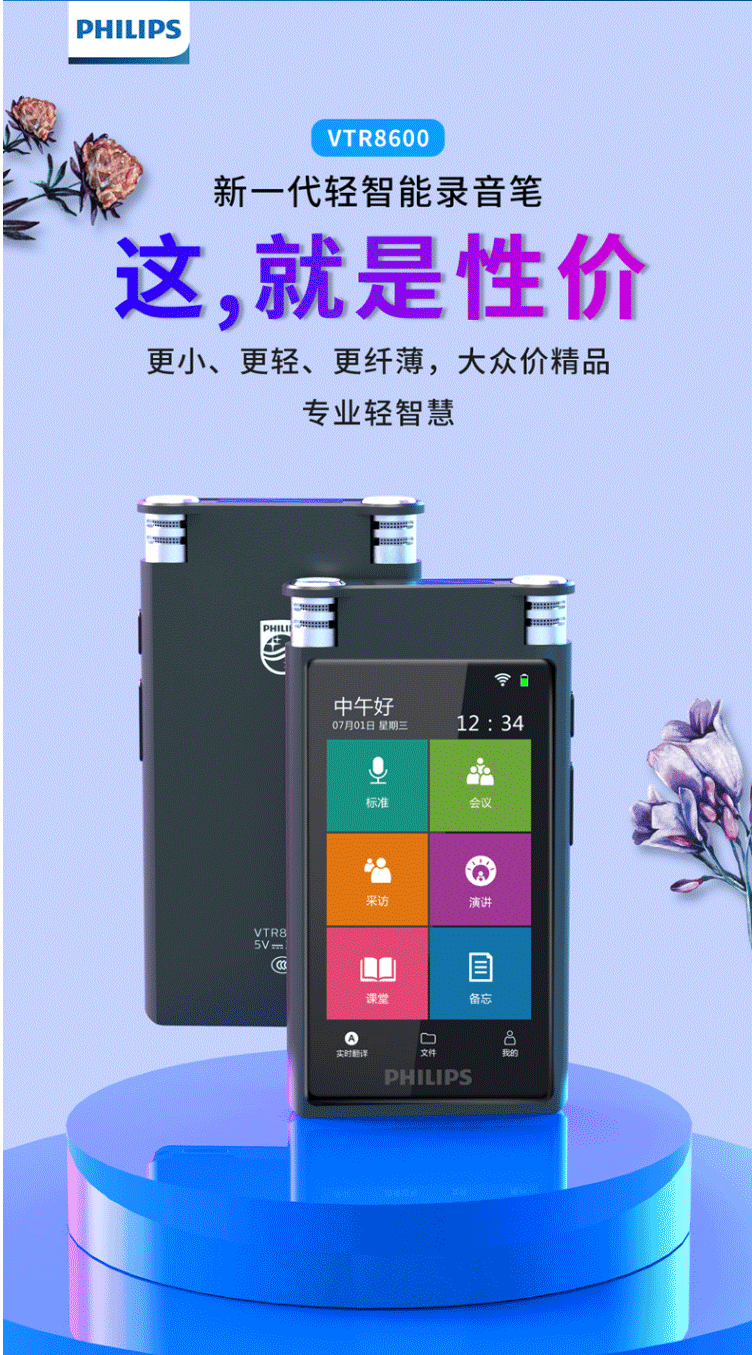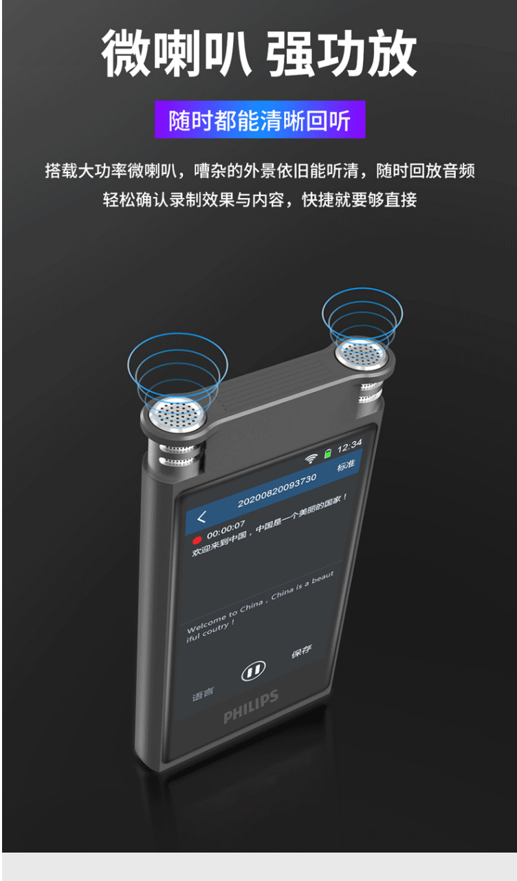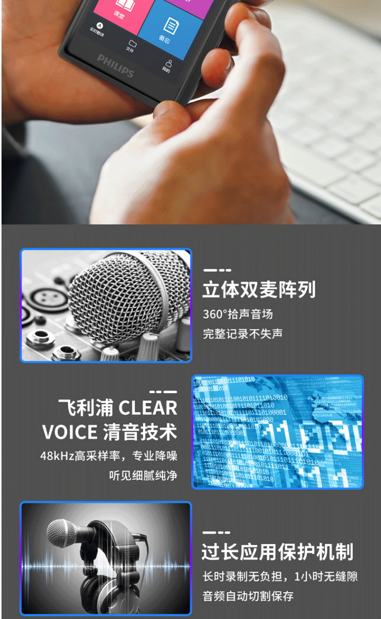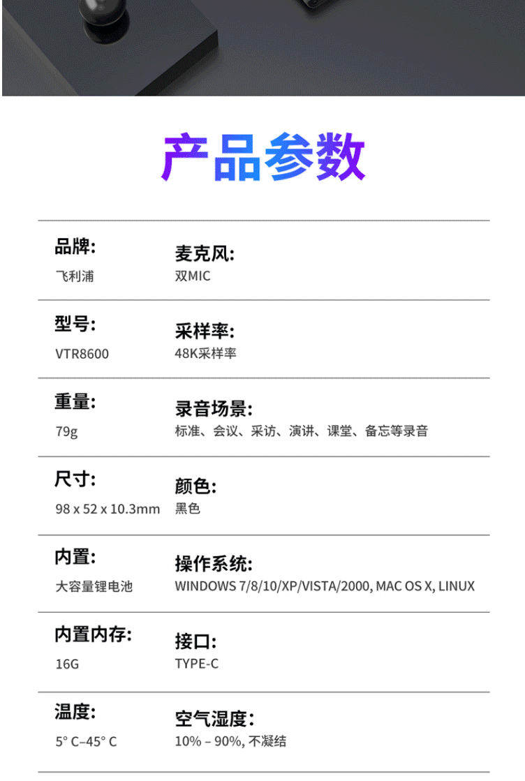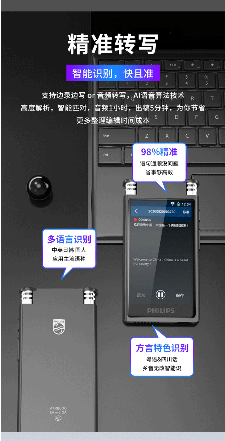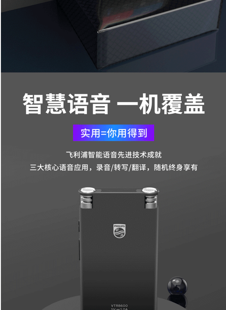 商品名称:飞利浦(PHILIPS)VTR8600 录音笔 16G 终身免费转写 录音实时翻译 专业级智能降噪