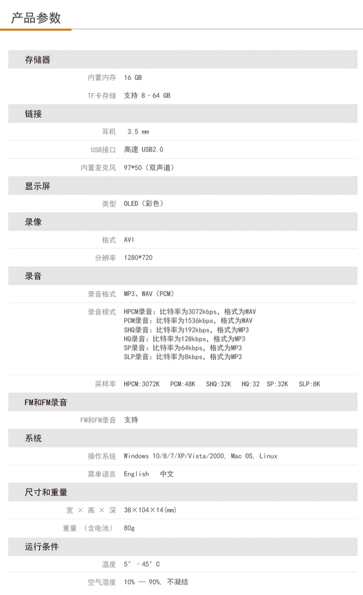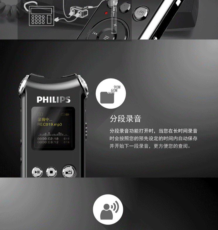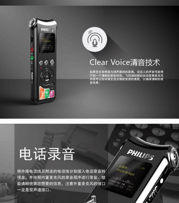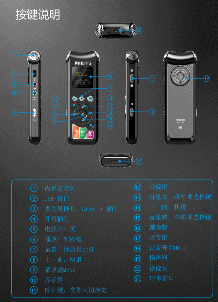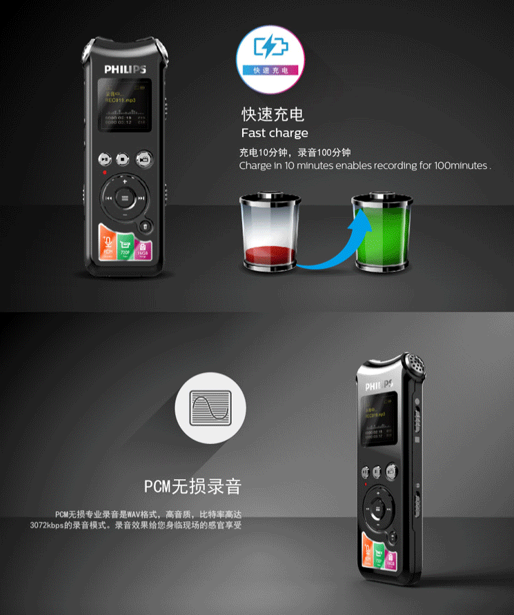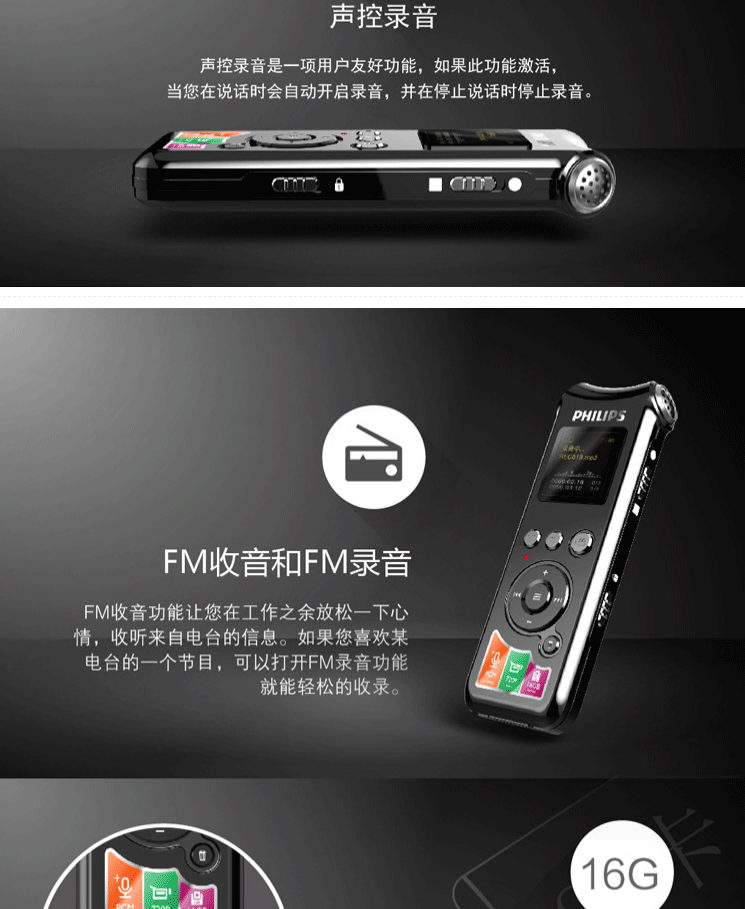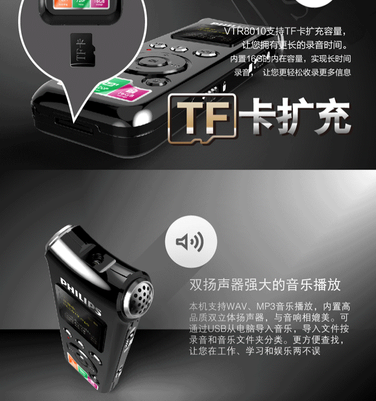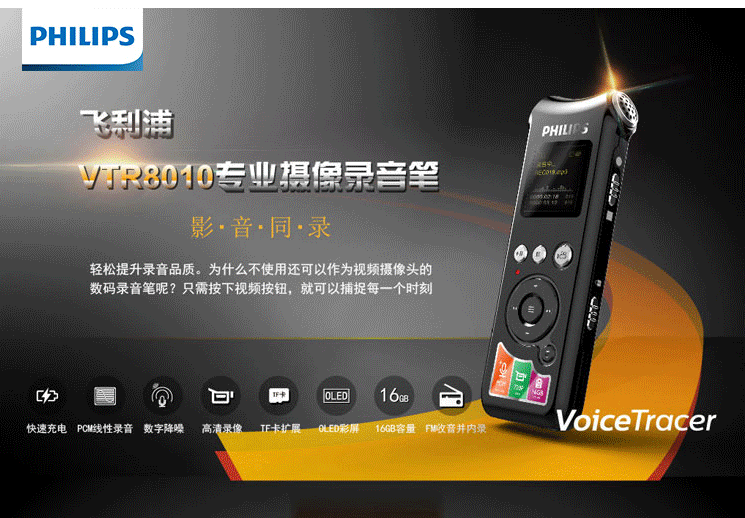 商品名称:飞利浦(PHILIPS)VTR8010 16GB 录音笔 720P高清录像摄像