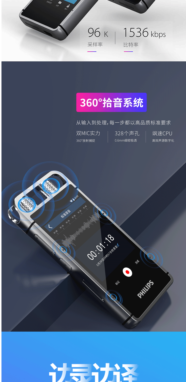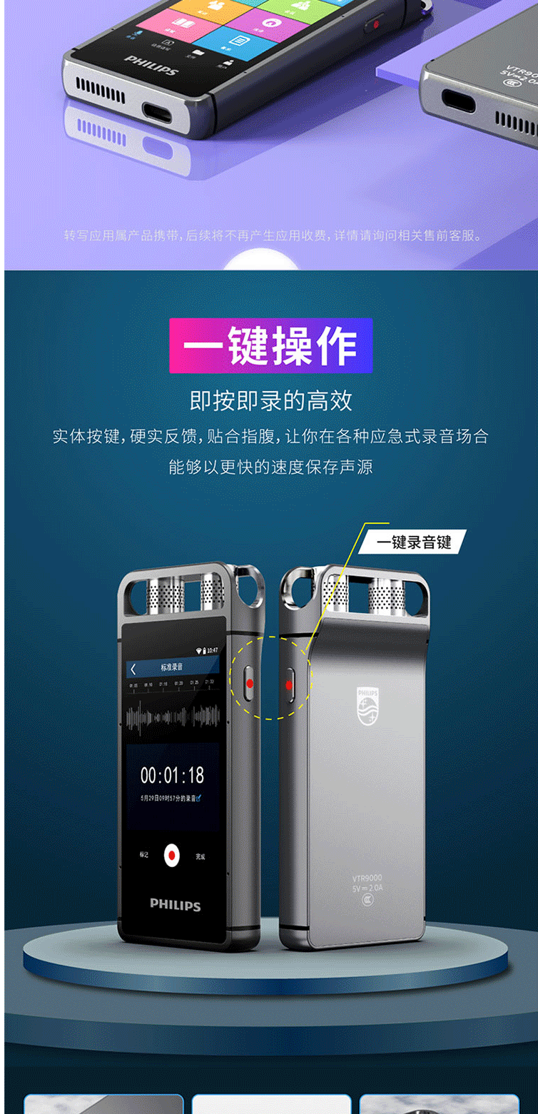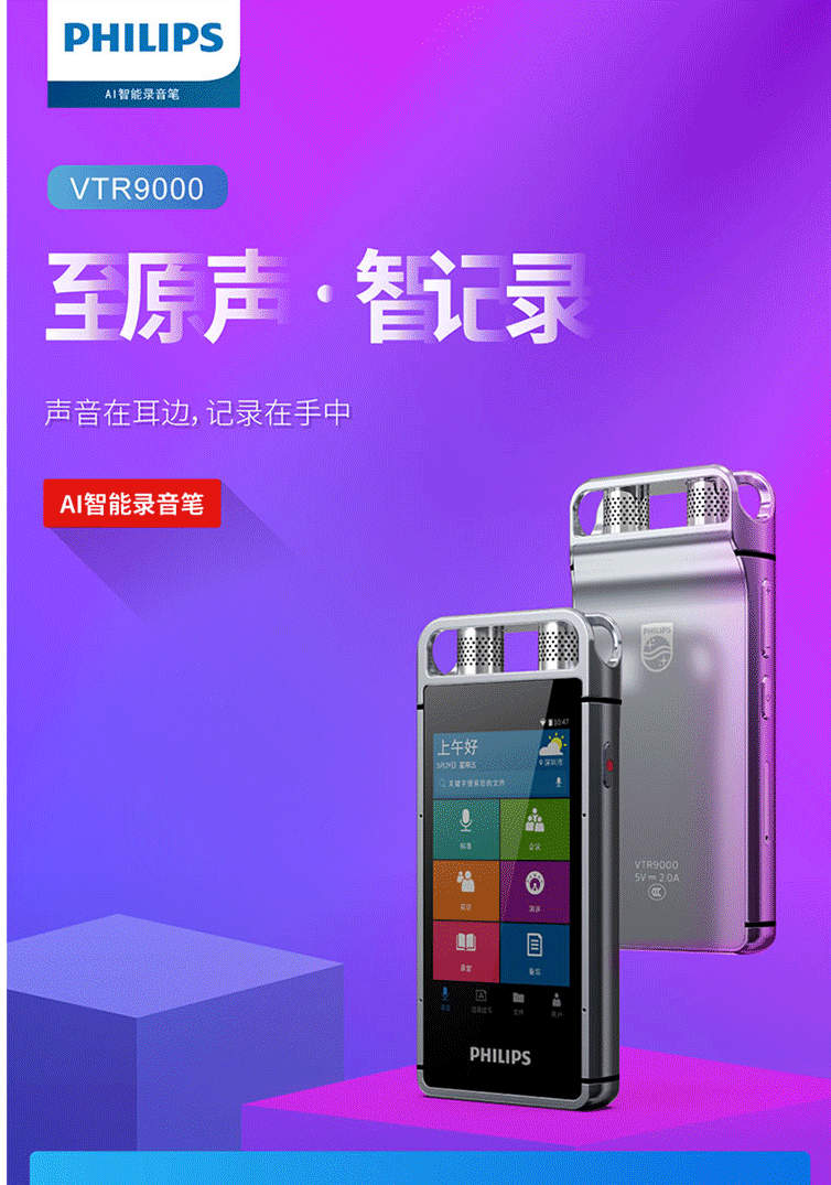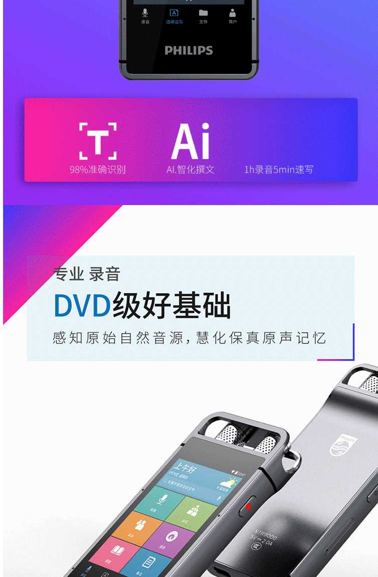 商品名称:飞利浦(PHILIPS)VTR9000 AI智能录音笔 16G 终身免费转文本 录写同步 WIFI 翻译 云空间储存