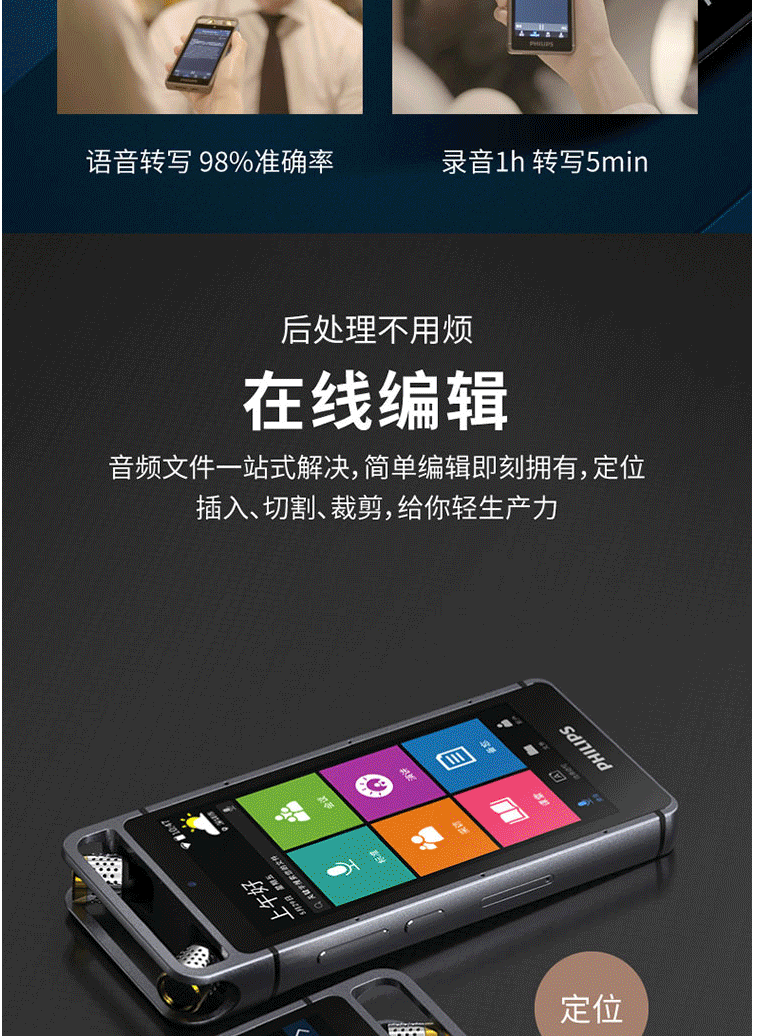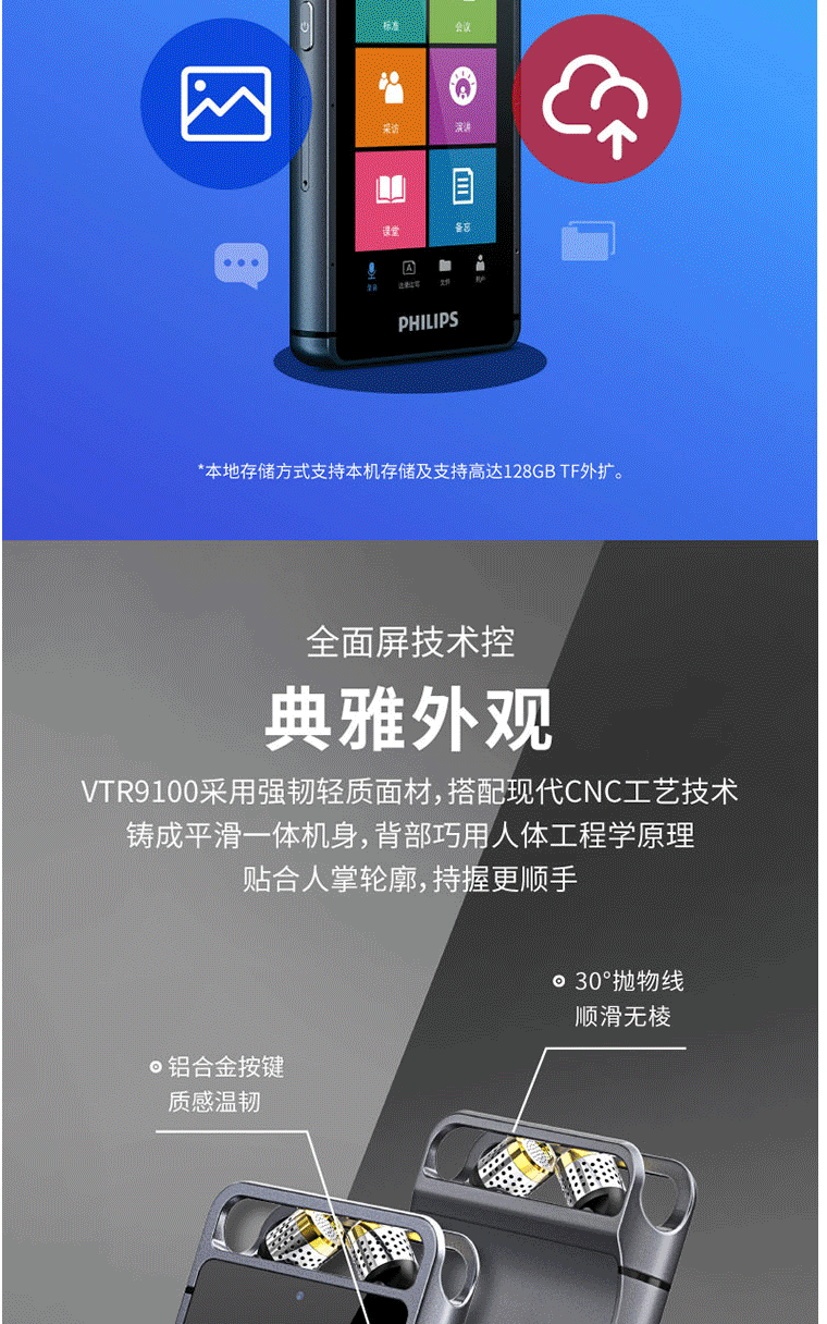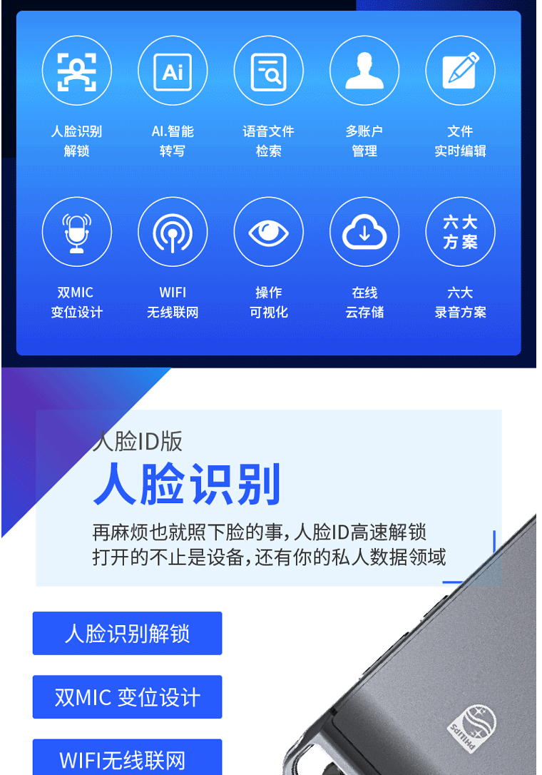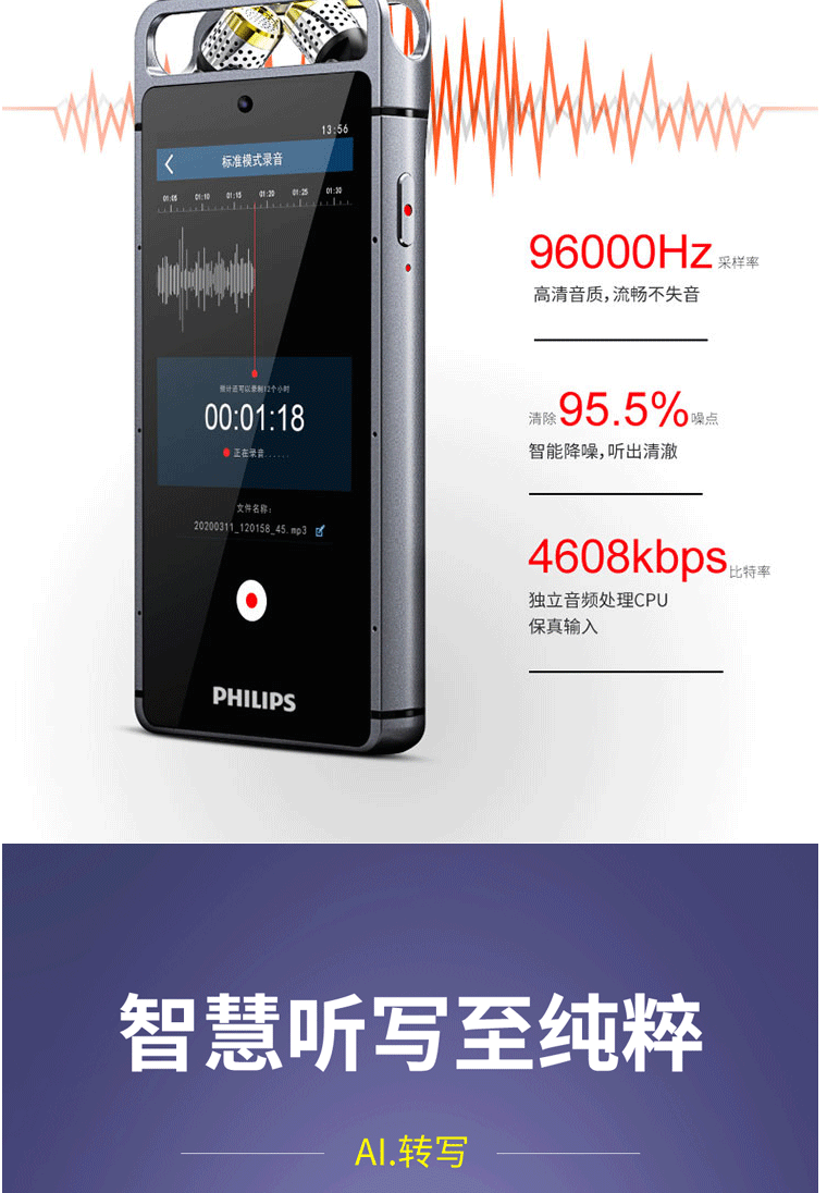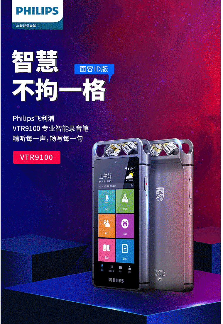 商品名称:飞利浦(PHILIPS)VTR9100 AI智能录音笔 32G 人脸识别 终身免费转文本 录写同步 WIFI 翻译 云空间储存