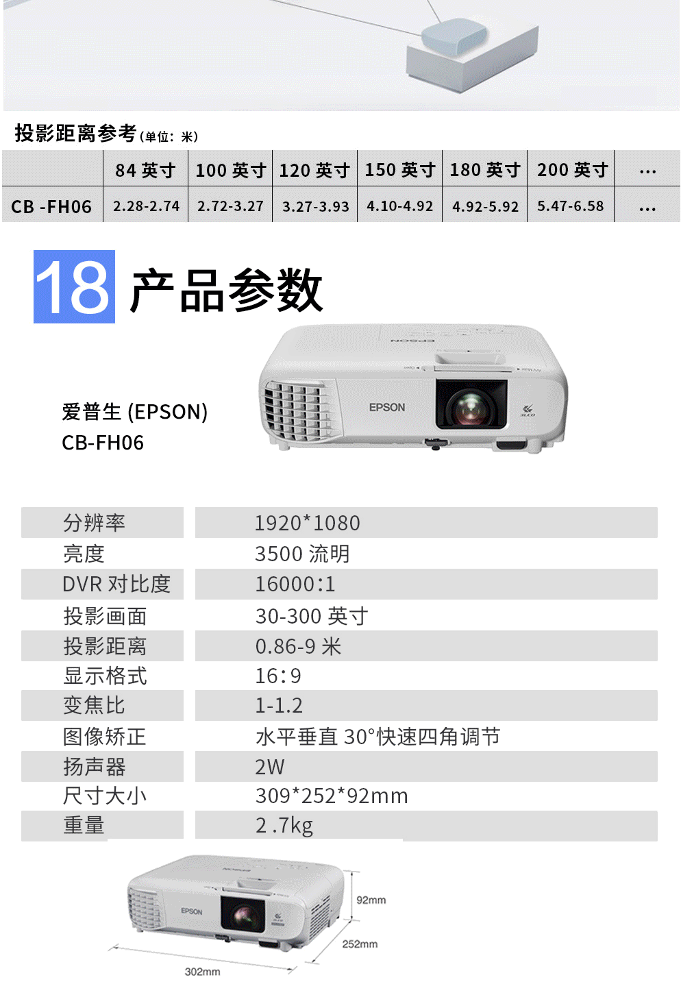 商品名称:爱普生(EPSON)CB-FH06 投影仪 投影机办公(1080P全高清 3500流明 支持侧投 )投影