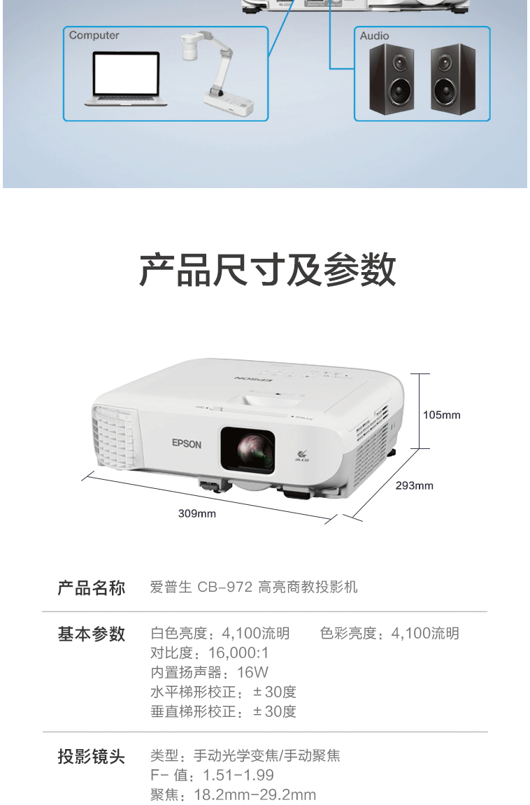 商品名称:爱普生(EPSON)CB-972 投影仪 投影机 (4100流明 双HDMI接口 支持侧面投影)