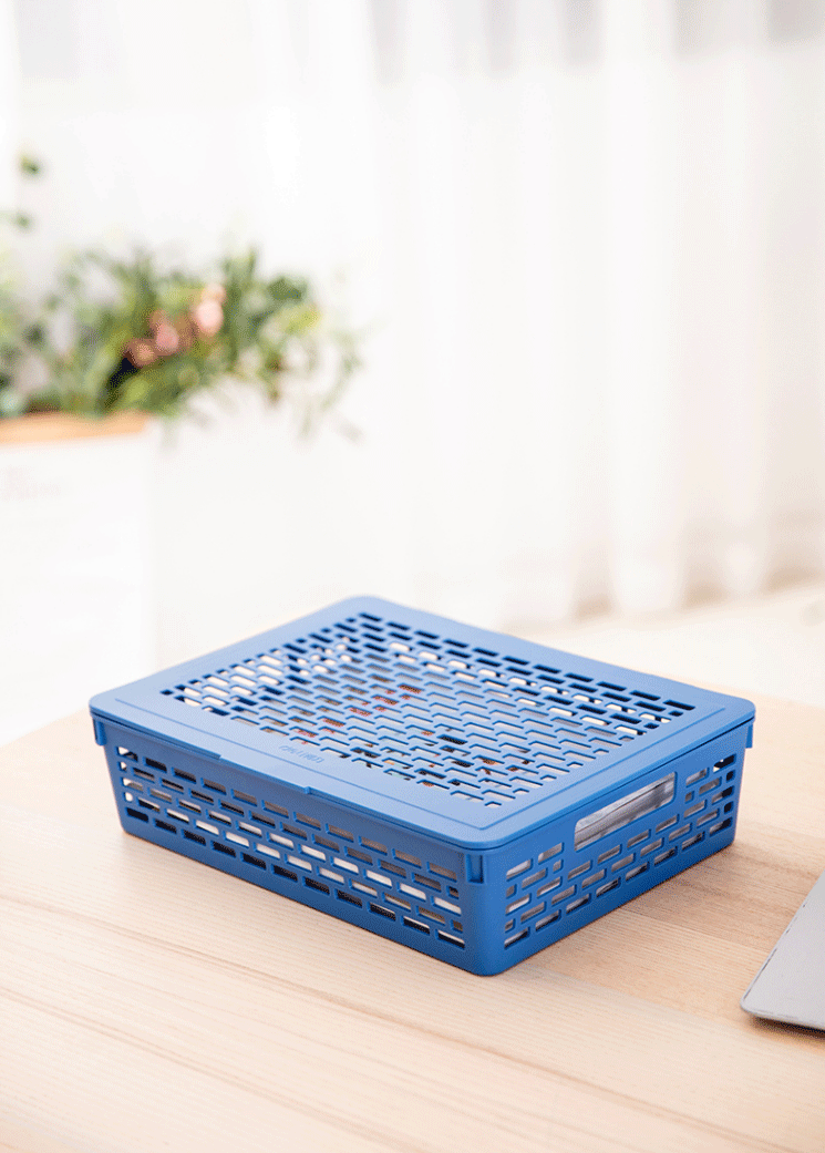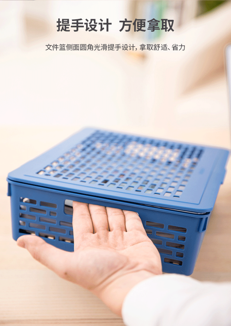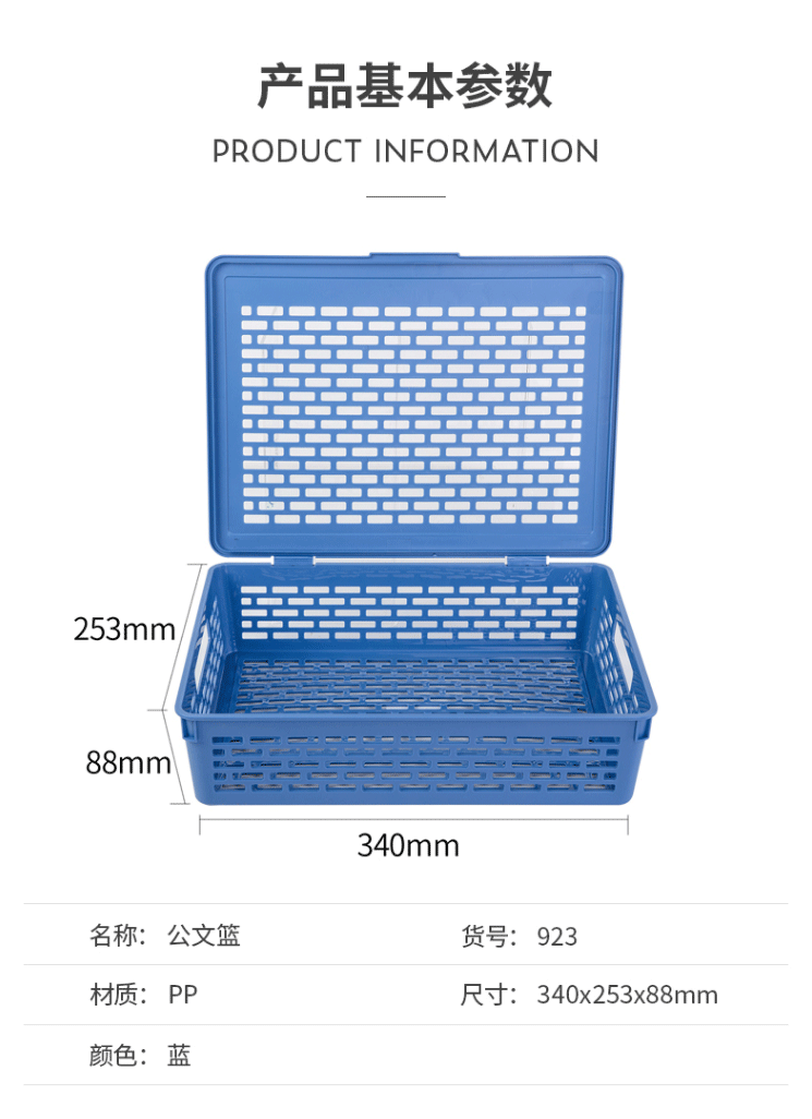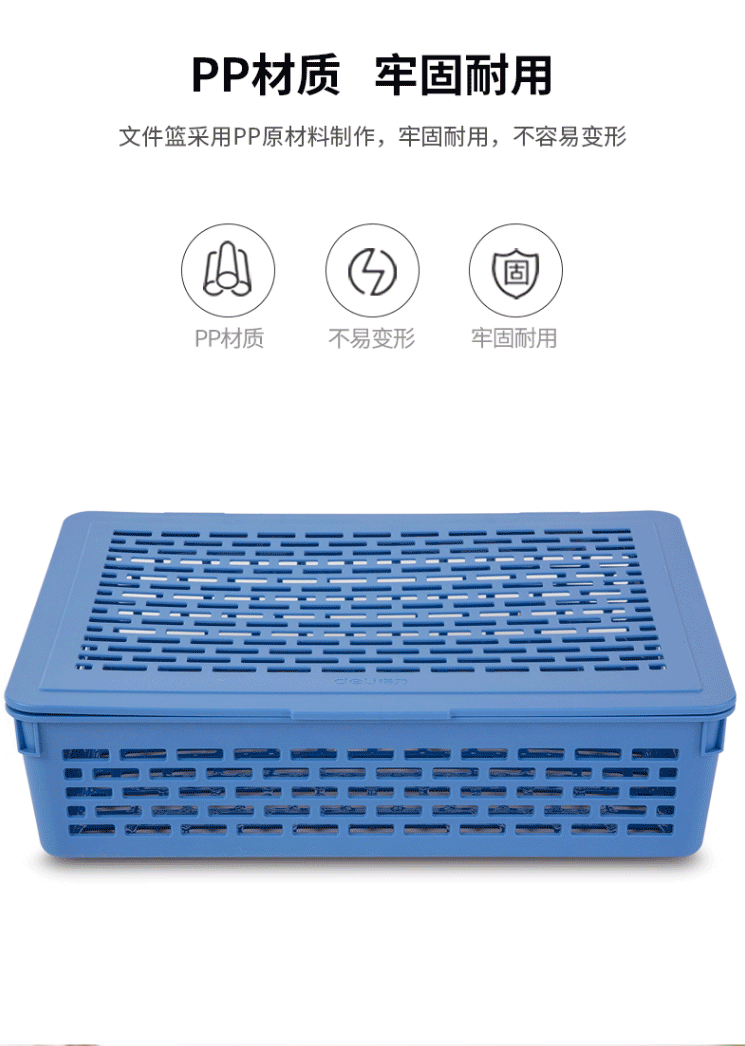 商品名称:得力(deli)923 A4带盖文件篮收纳篮塑料公文篮文件筐蓝色