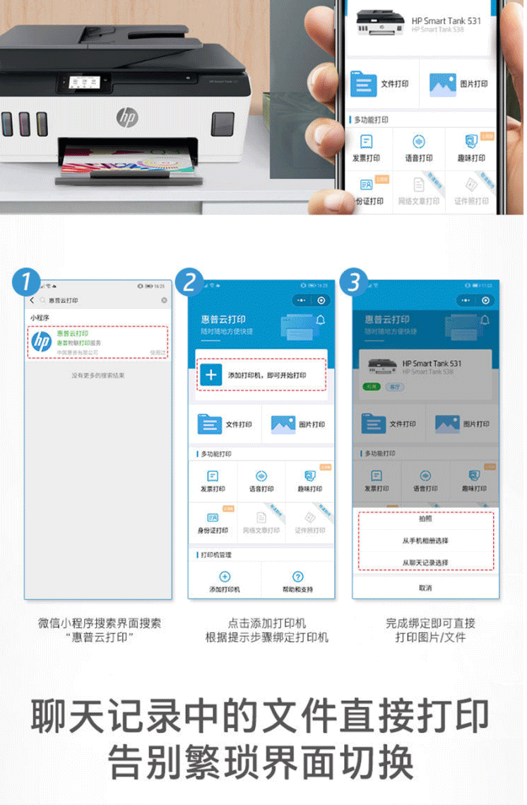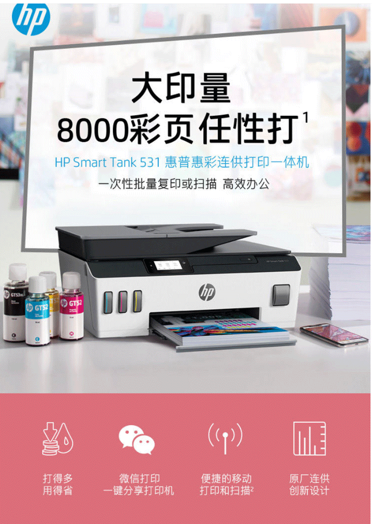 惠普 HP Tank531 A4彩色连供无线打印一体机三合一彩色打印机