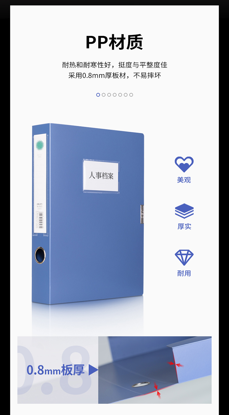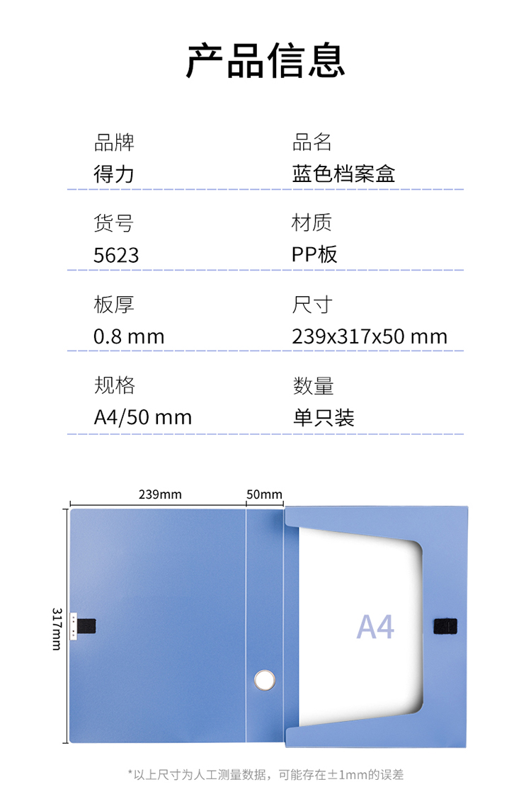 商品名称:得力(deli)50mmA4塑料档案盒 资料文件收纳盒 财务凭证盒5623蓝色(单位:个)