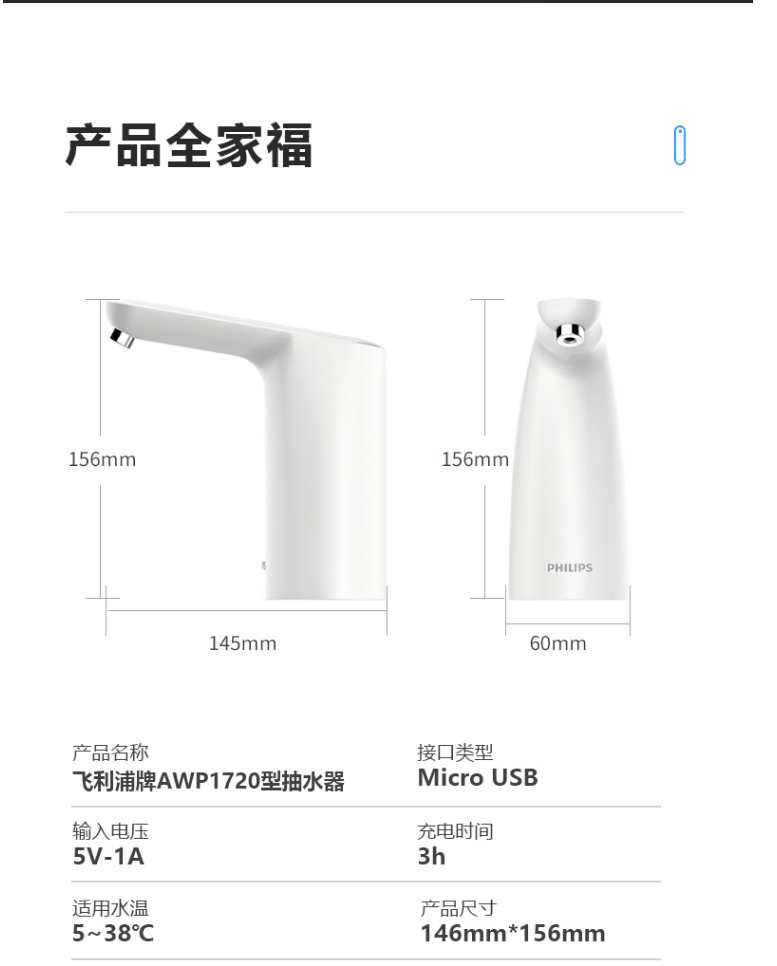 商品名称:飞利浦(PHILIPS)桶装水电动抽水机 抽水器上水器 AWP1720