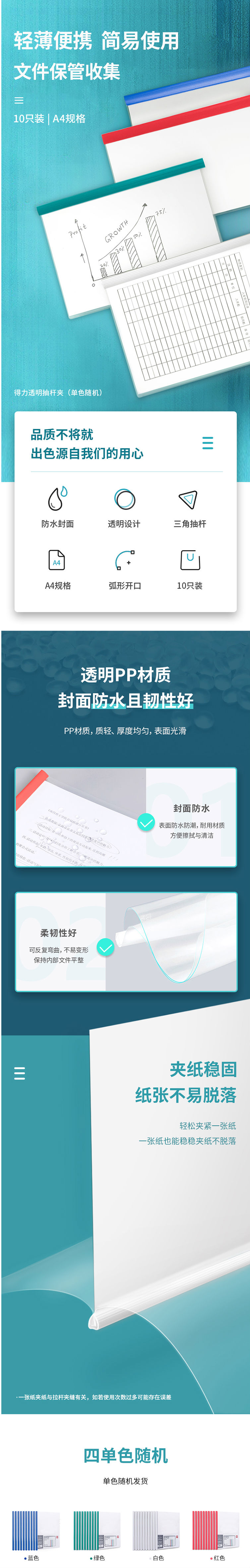商品名称:得力(deli) A4拉杆夹抽杆夹 5854 10只装单色随机