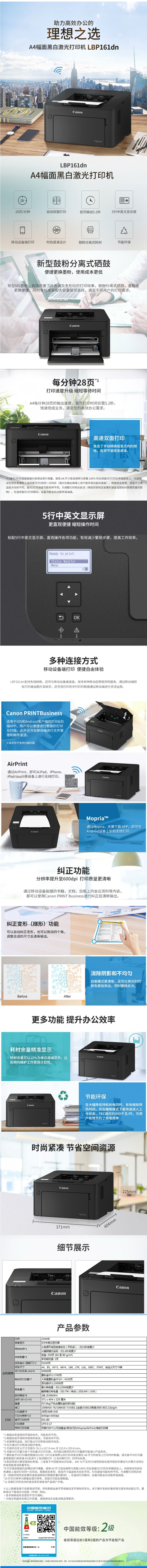 商品名称:佳能(CANON)LBP161DN黑白激光打印机 A4幅面 自动双面打印 有线网络打印 鼓粉分离
