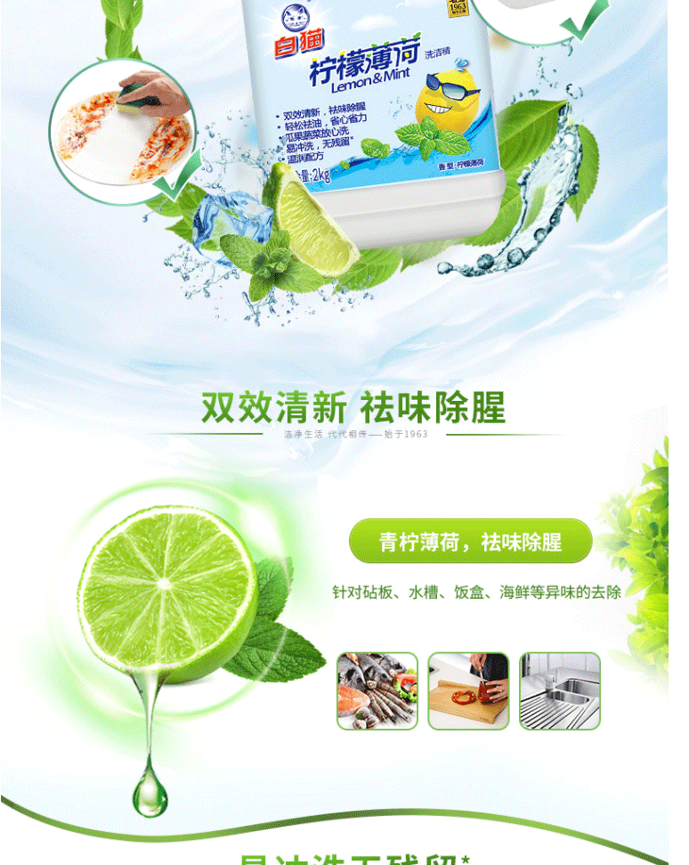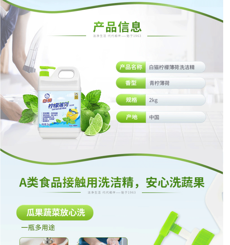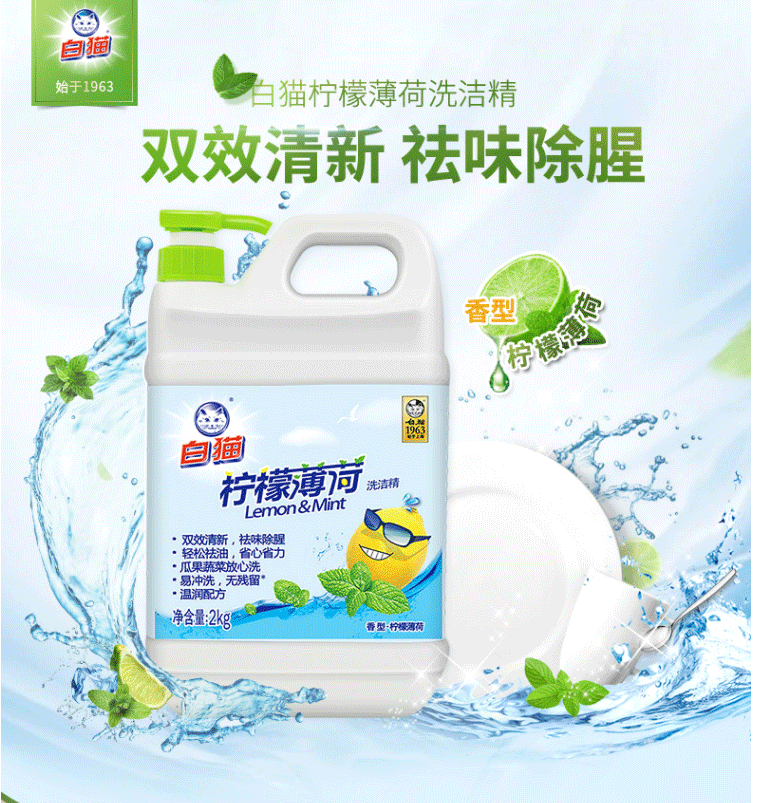 商品名称:白猫 柠檬薄荷洗洁精2kg*8瓶(整箱装)