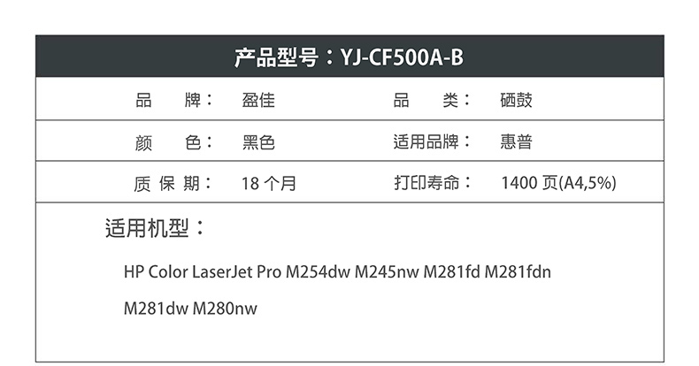 商品名称:盈佳YJ CF500A(202A)黑鼓-1.4K(带芯片) 适用于:HP Color LaserJet Pro M254dw M245nw M281fd M281fdn M281dw M280nw