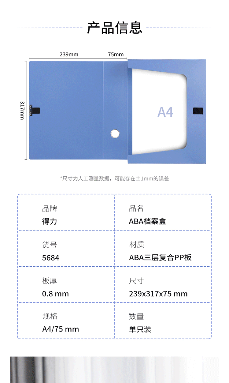 商品名称:得力(deli) 75mm档案盒 A4塑料档案盒 加厚 5684