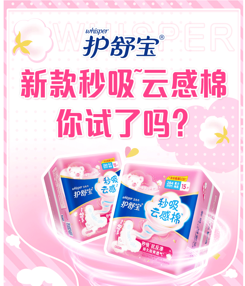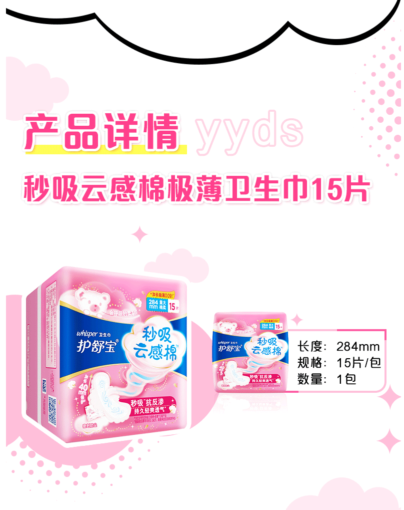 商品名称:护舒宝 秒吸云感棉 极薄量多日用/夜用卫生巾 284mm 15片/包 12包装