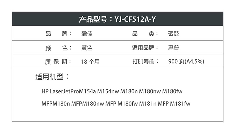 商品名称:盈佳YJ CF512A(204A)黄鼓-0.9K(带芯片) 适用于:HP LaserJetProM154a M154nw M180n M180nw M180fw MFPM180n MFPM180nw MFP M180fw M181n MFP