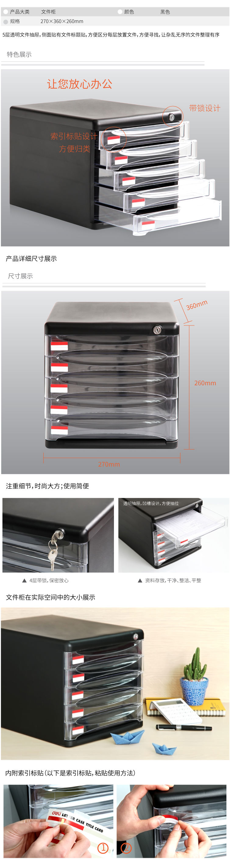 商品名称:得力(deli)5层带锁手拉桌面文件柜 带索引标签抽屉资料收纳柜 9795黑色