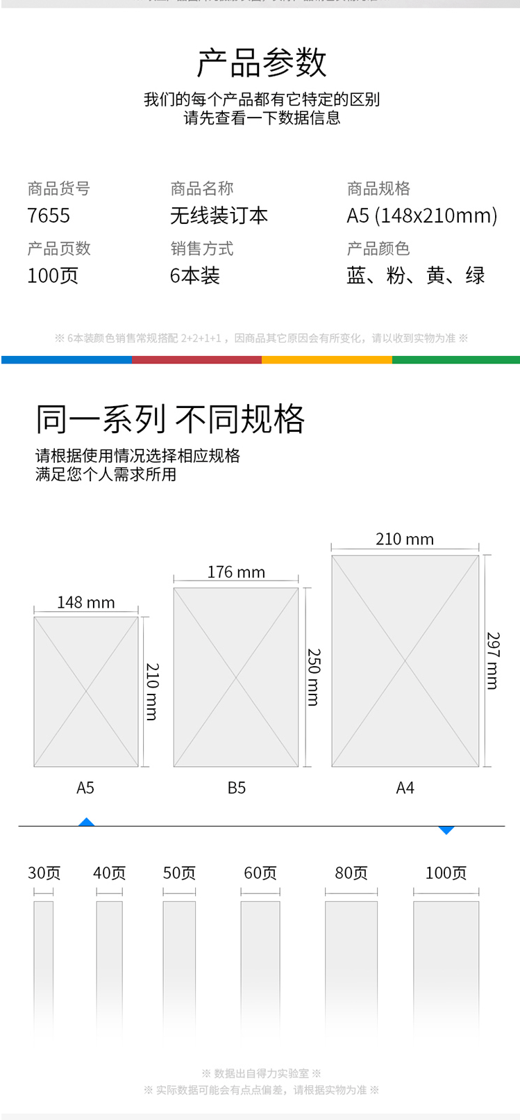 商品名称:得力7655办公无线装订本(混) A5-100张 6本/包