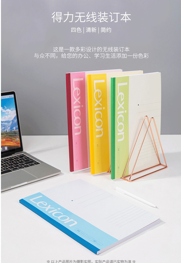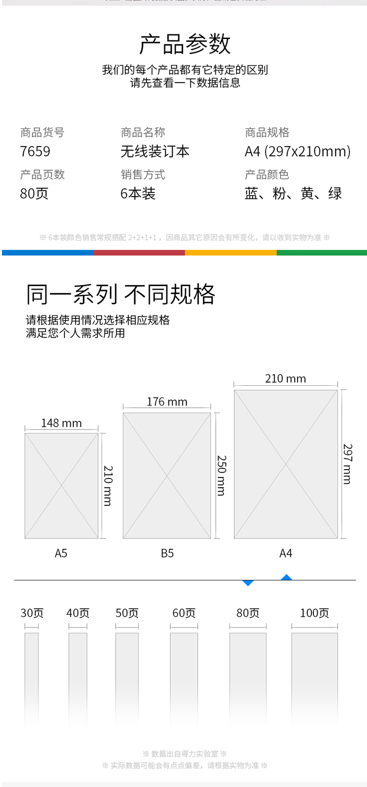 商品名称:得力7659办公无线装订本(混) A4-80张 6本/包