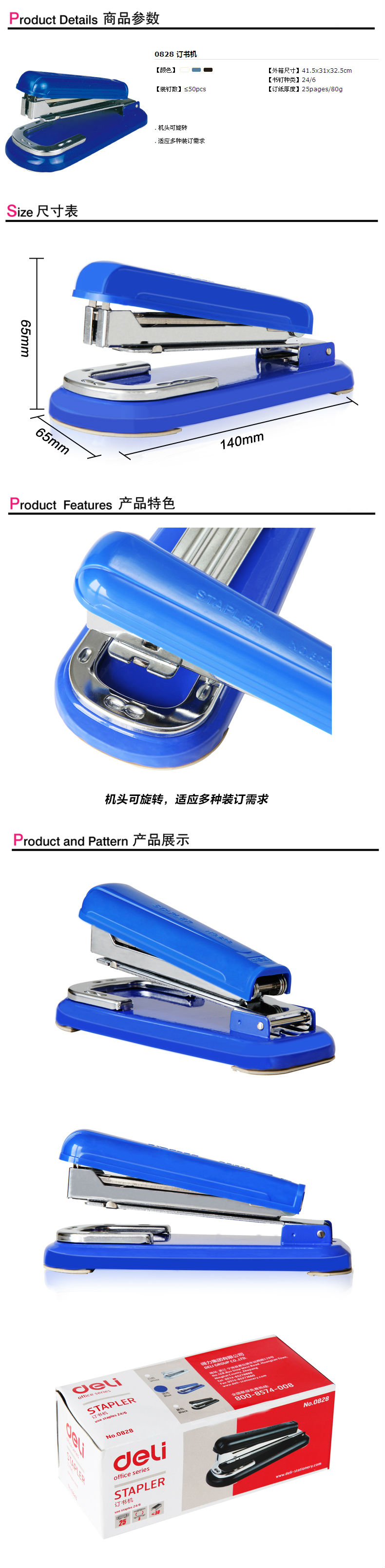 商品名称:得力(deli) 0828-12#办公旋转型订书机 装订用品订书机 颜色随机