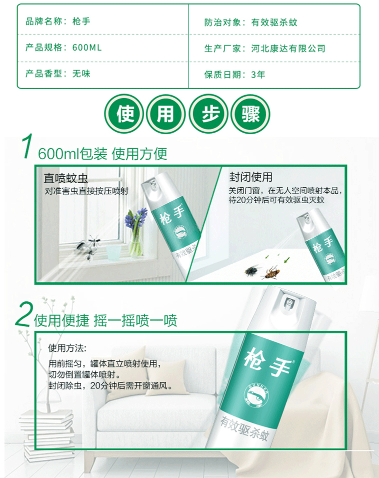 商品名称:枪手 杀蚊气雾剂 无味 600毫升 杀虫剂 杀蚊喷雾