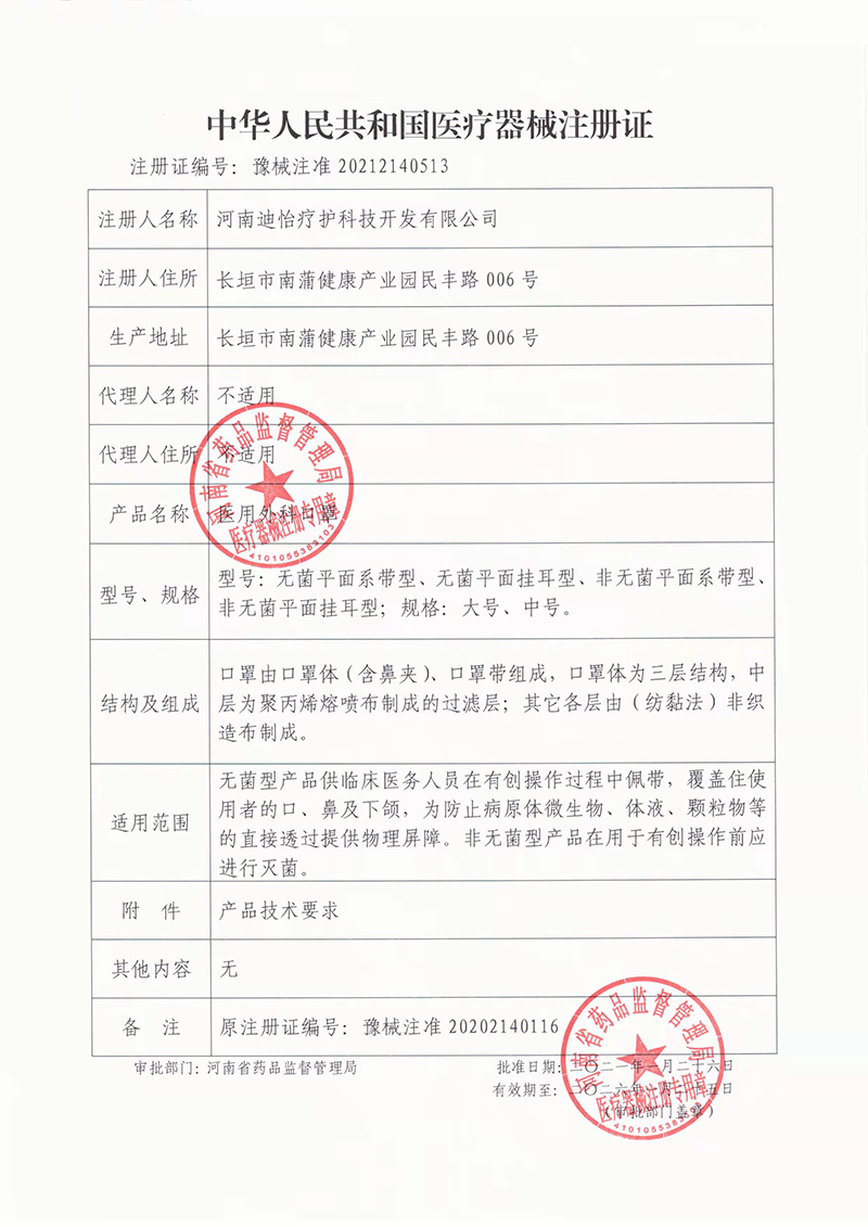 医疗器械注册证编号:豫械注准20202140116