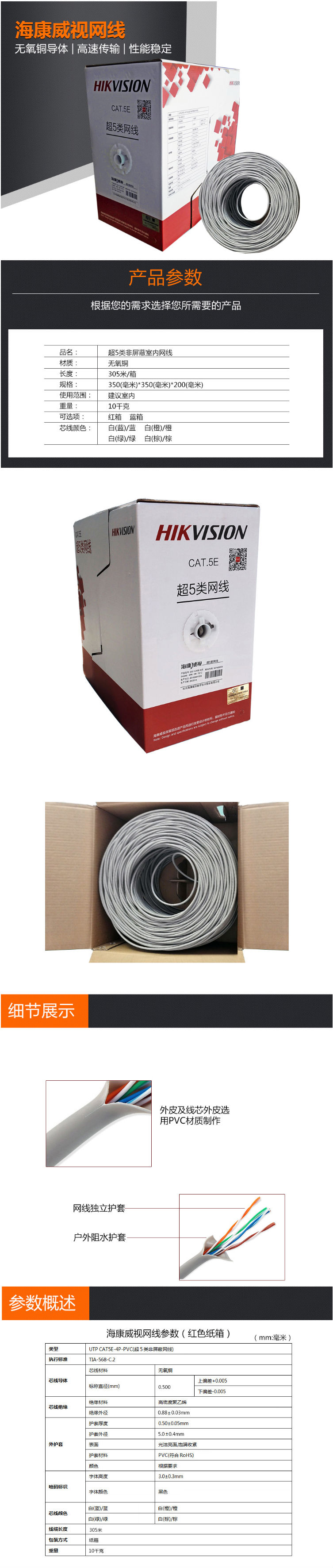 商品名称:海康威视 DS-1LN5E-S/E 超五类网线 无氧铜室内网线 300米/箱