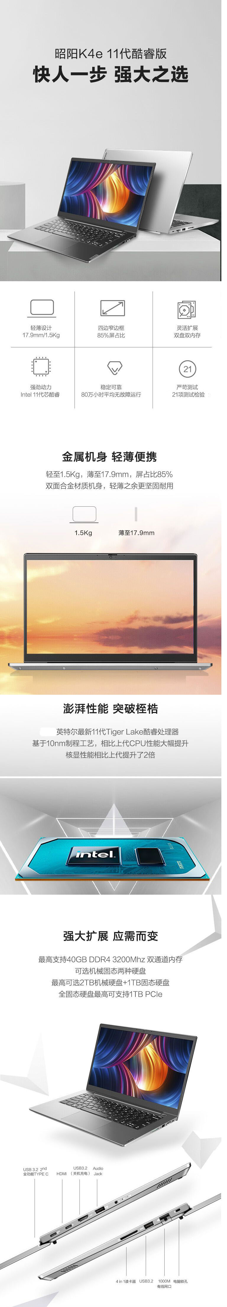 商品名称:联想笔记本电脑 昭阳K4E ITL I5 1135G7U/8G/256G+1T/锐炬显卡/W10
