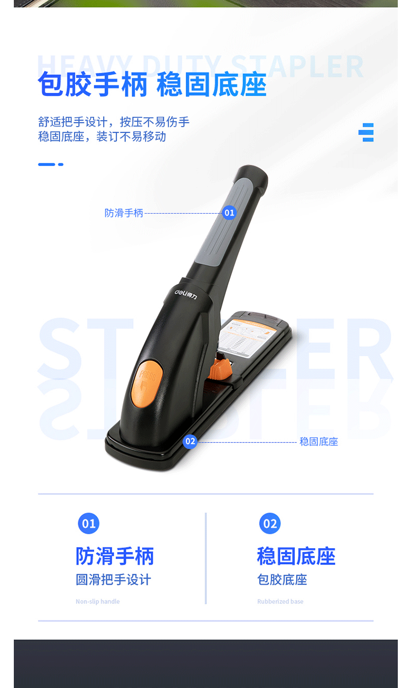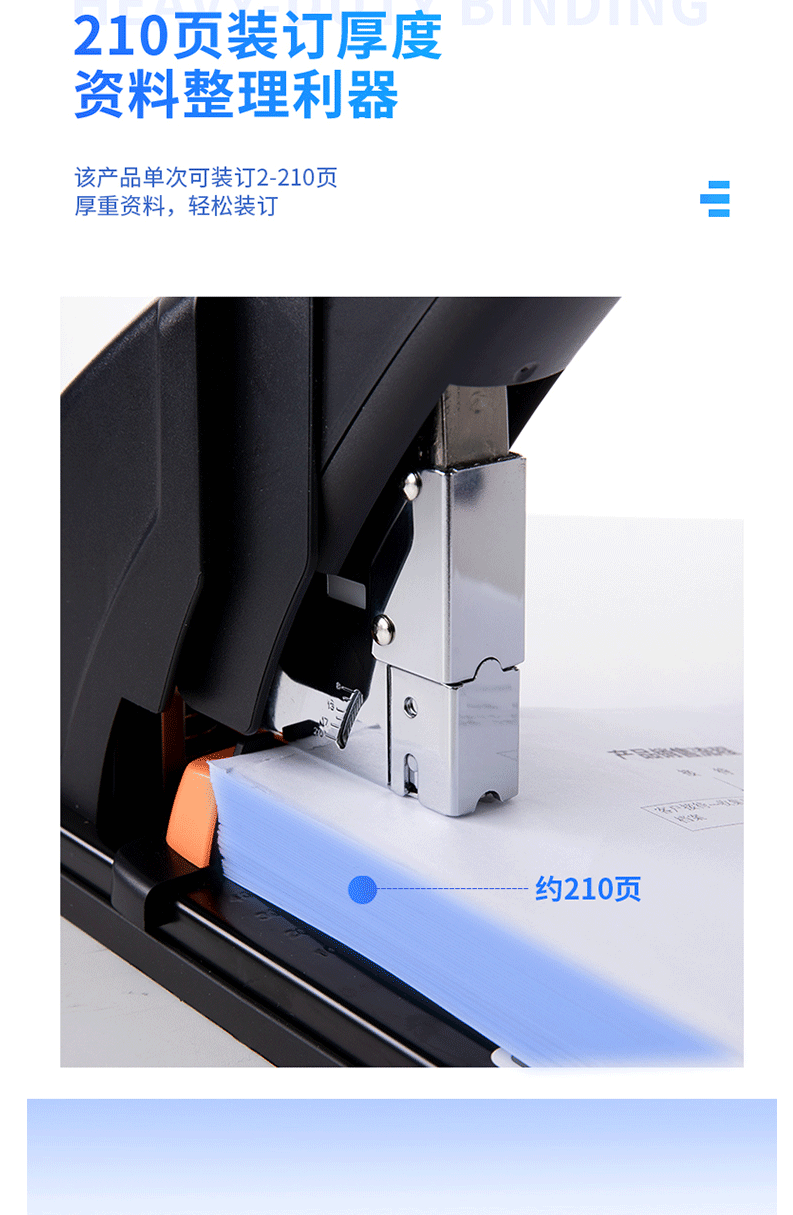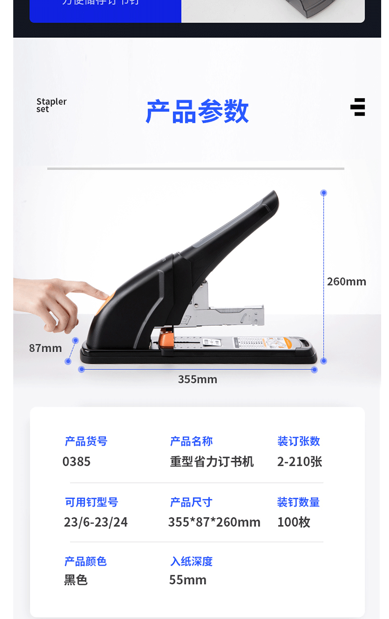 商品名称:得力(deli)210页省力重型订书机 黑色0385