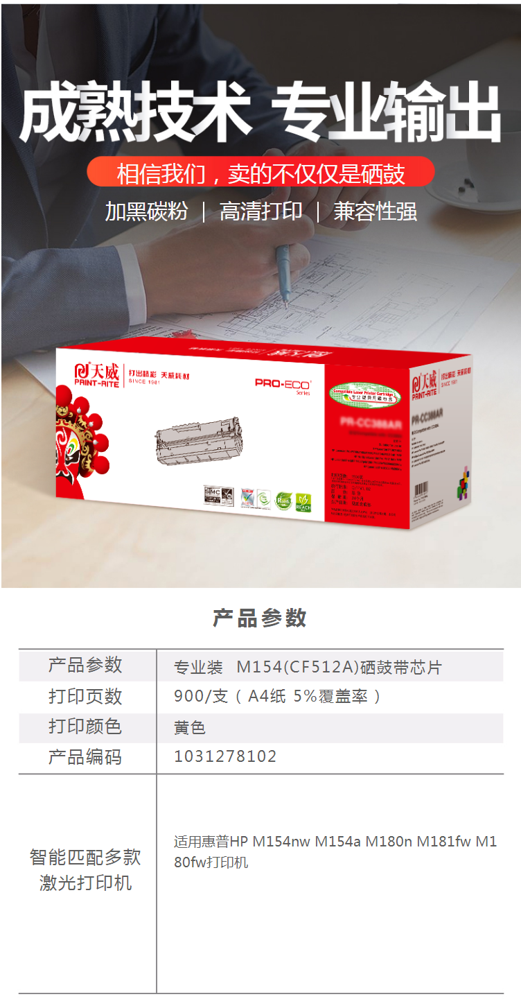 商品名称:天威 CF512A硒鼓 204A硒鼓 黄色带芯片 (适用HP M154nw M154a M180n M181fw M180fw打印机)