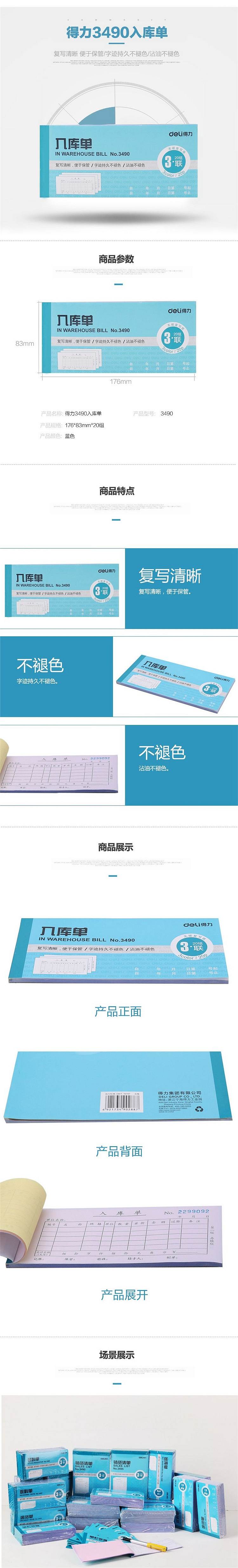 商品名称:得力(deli)三联入库单 无碳复写 3490 (10本/包)