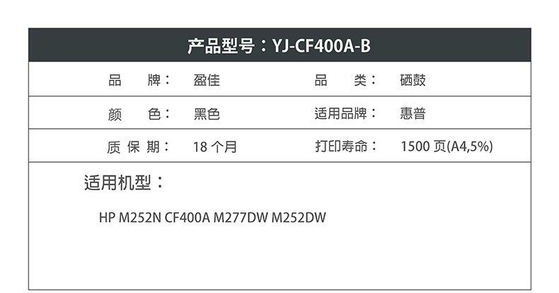 商品名称:盈佳YJ CF400A(201A)黑鼓-1.5K(带芯片) 适用于:HP M252N CF400A M277DW M252DW