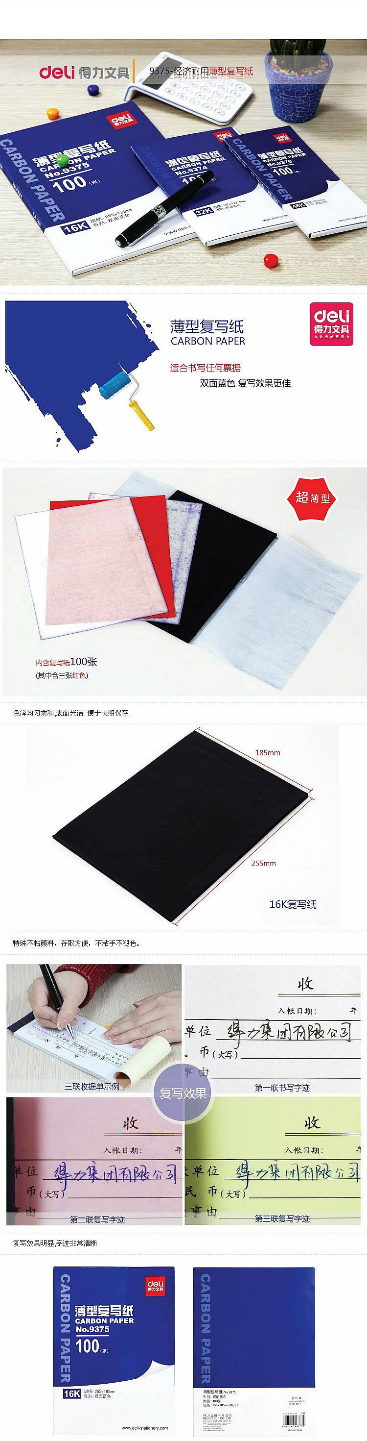 商品名称:得力(deli)16K经济耐用薄型双面复写纸(25.5*18.5cm) 100张/盒 9375蓝