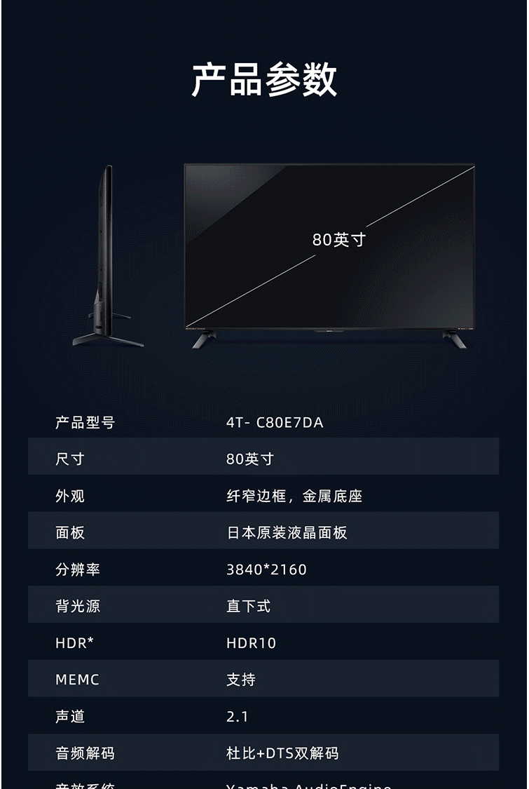 商品名称:电视 夏普(SHARP)4T-C80E7DA 80英寸 4K超高清 双频wifi 面板电视