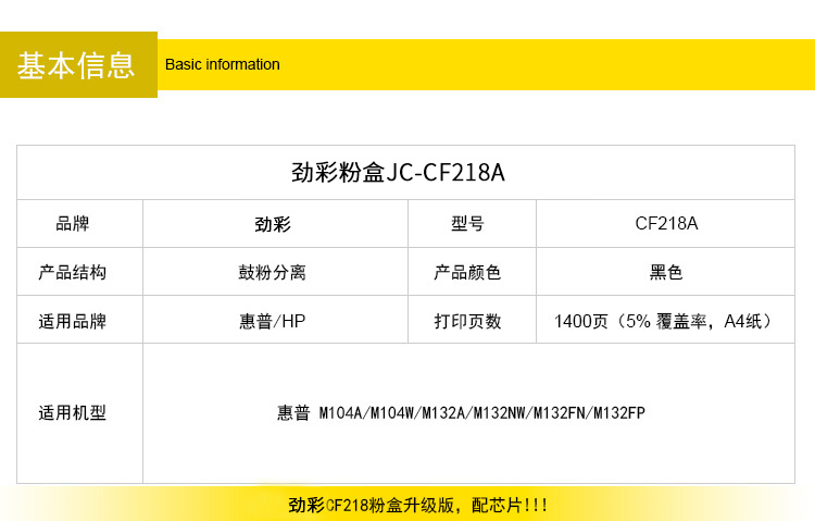 商品名称:劲彩CF218A粉盒带芯片 适用惠普LaserJet M132a\nw\fn\fp\fw M104a\w