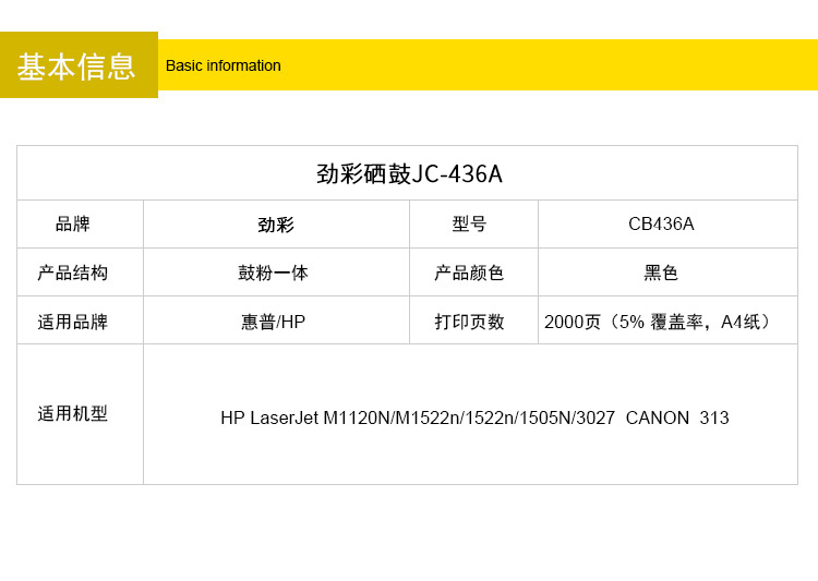 商品名称:劲彩CB436A硒鼓 适用惠普 P1505 P1500 M1522NF M1120 佳能3250
