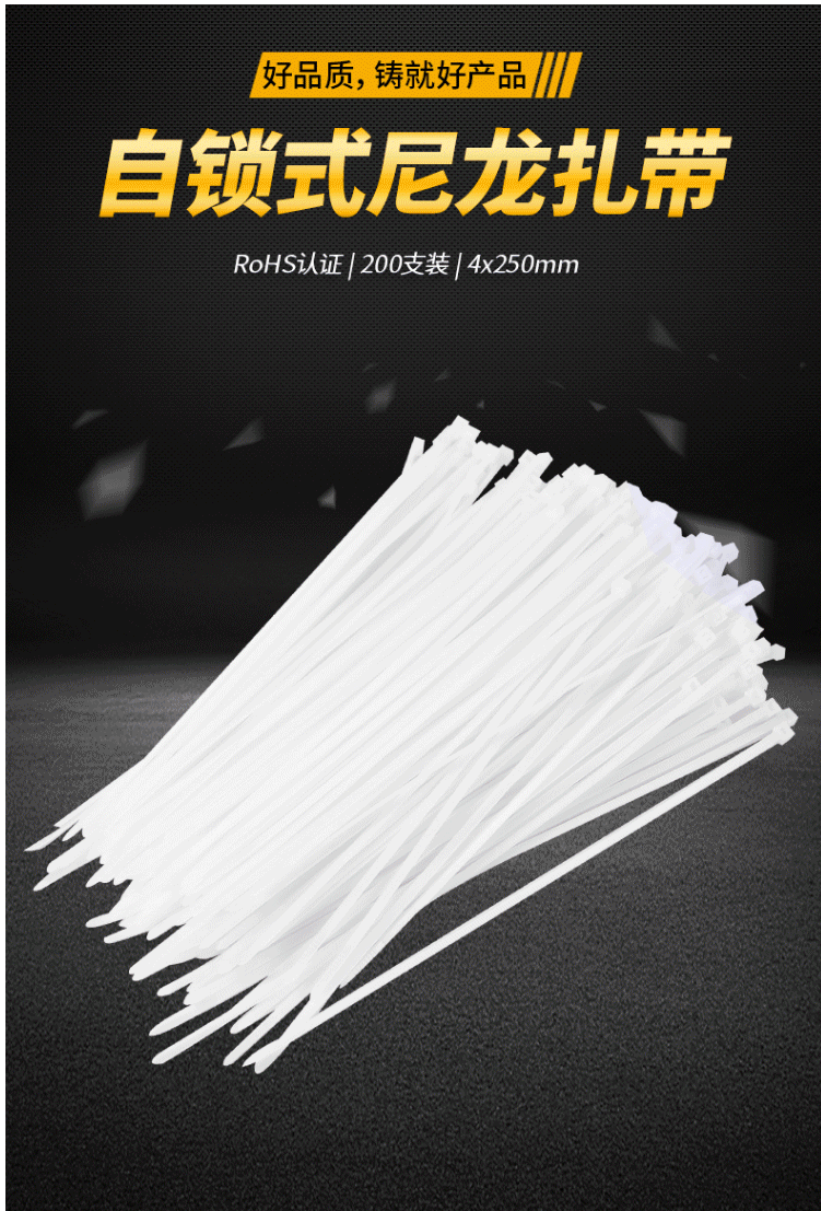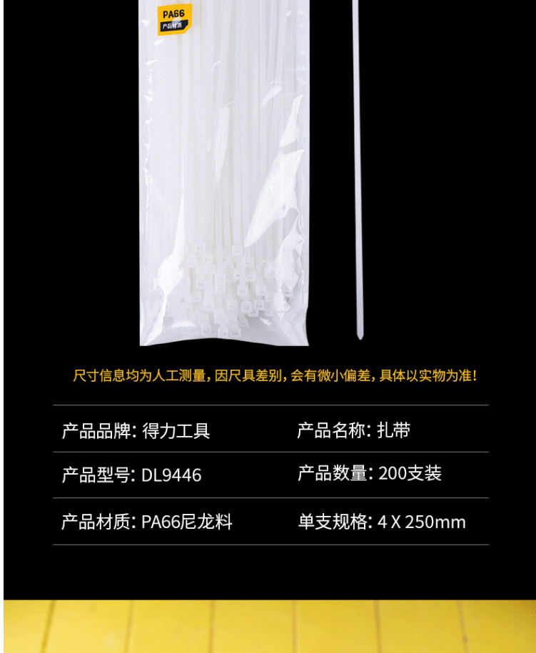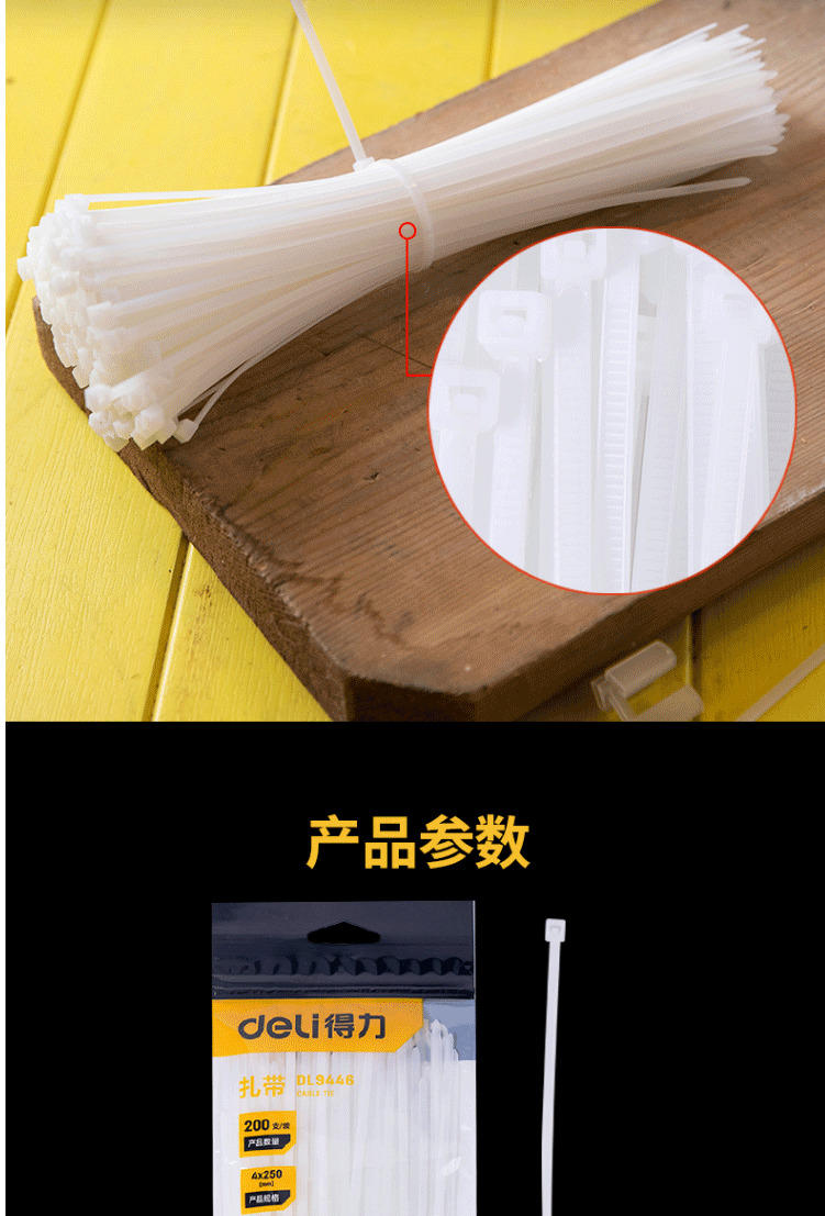 商品名称:得力(deli) 自锁式尼龙扎带 理线带 扎线 4.0*250mm 白色 200支装 DL9446