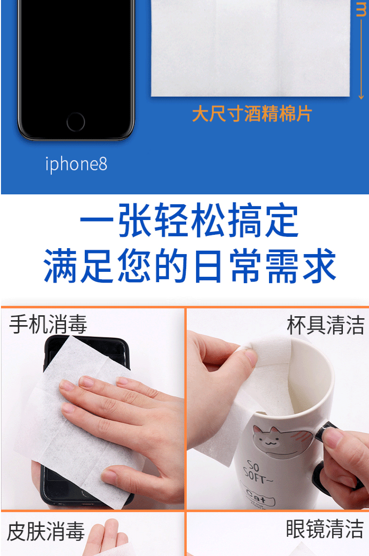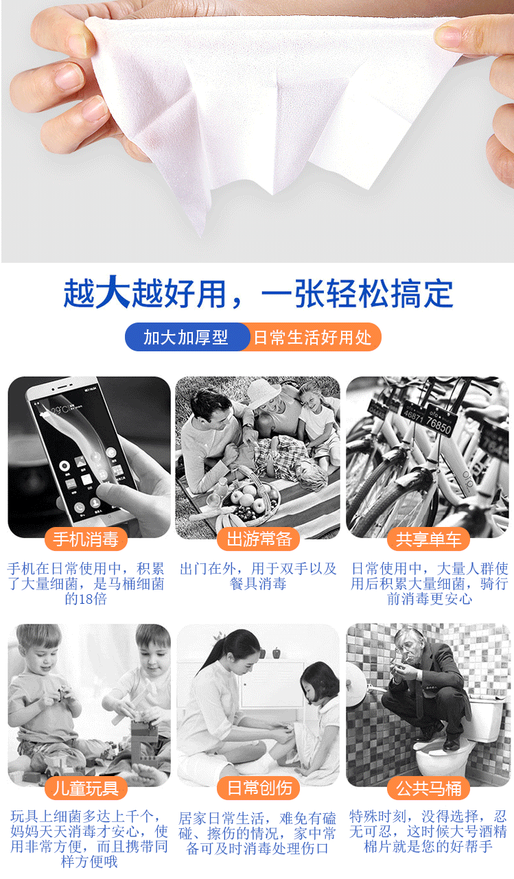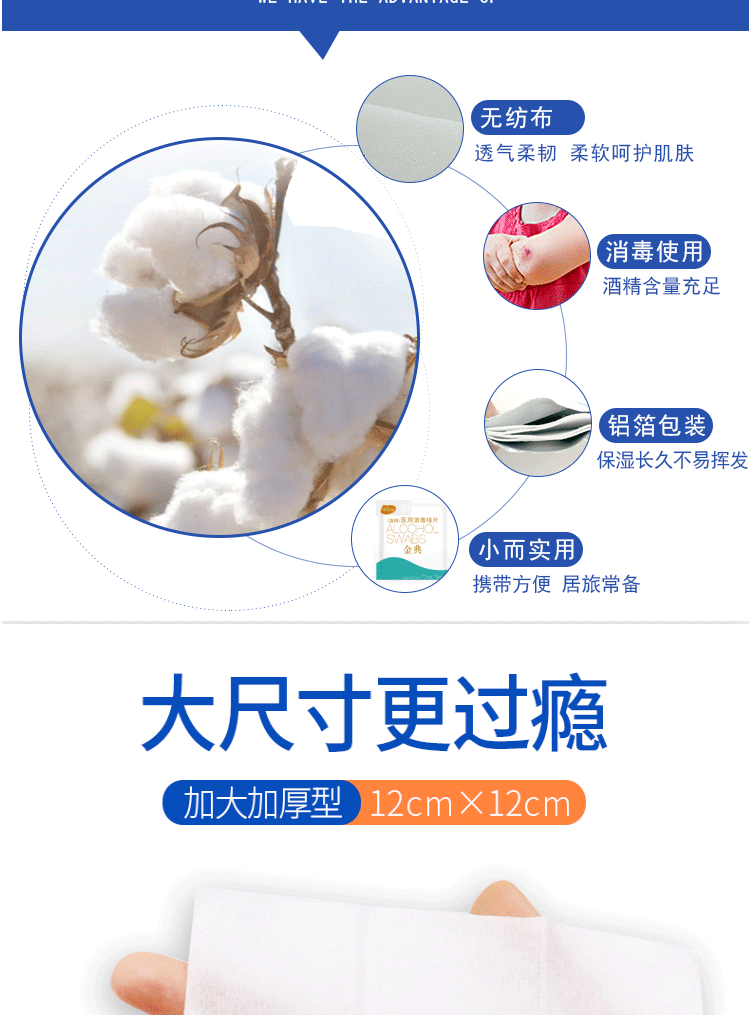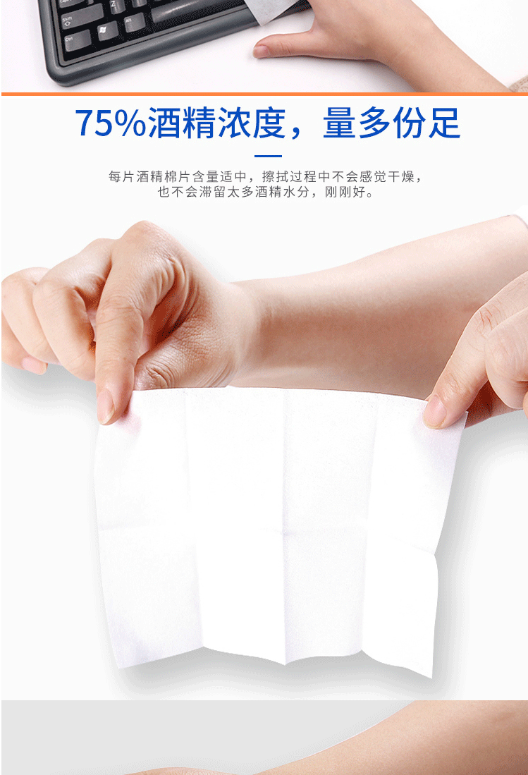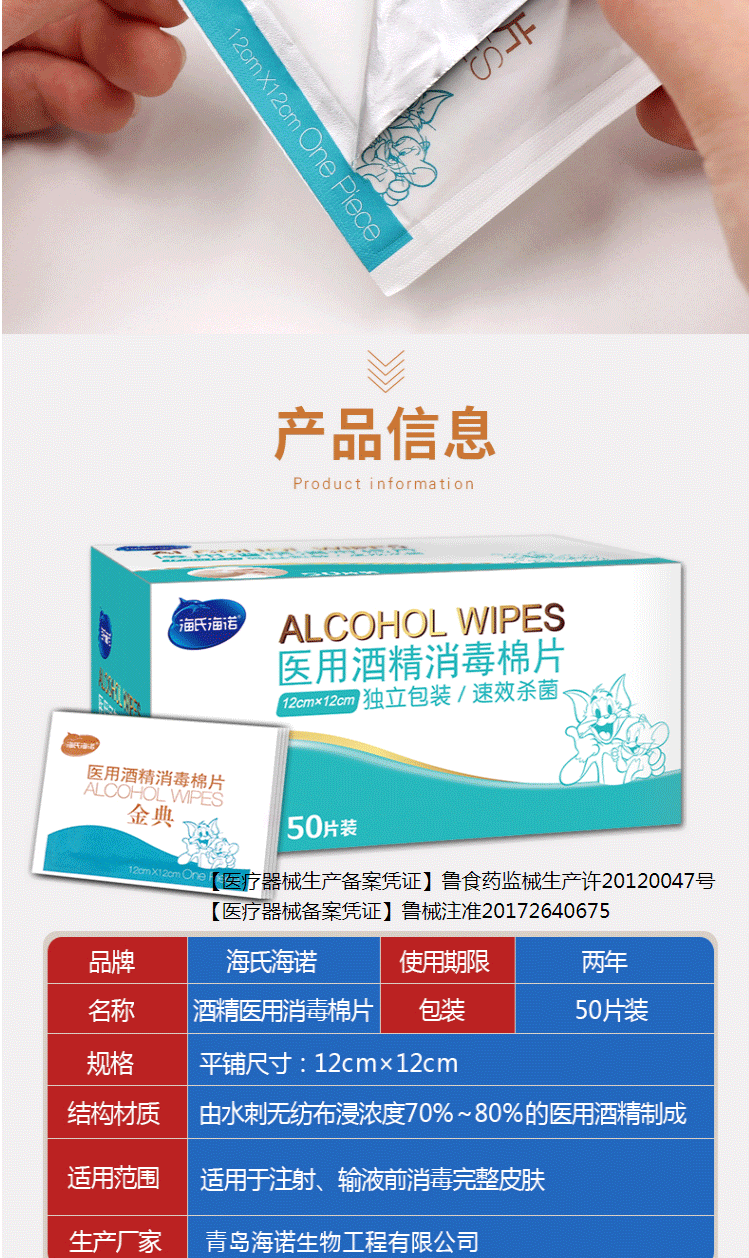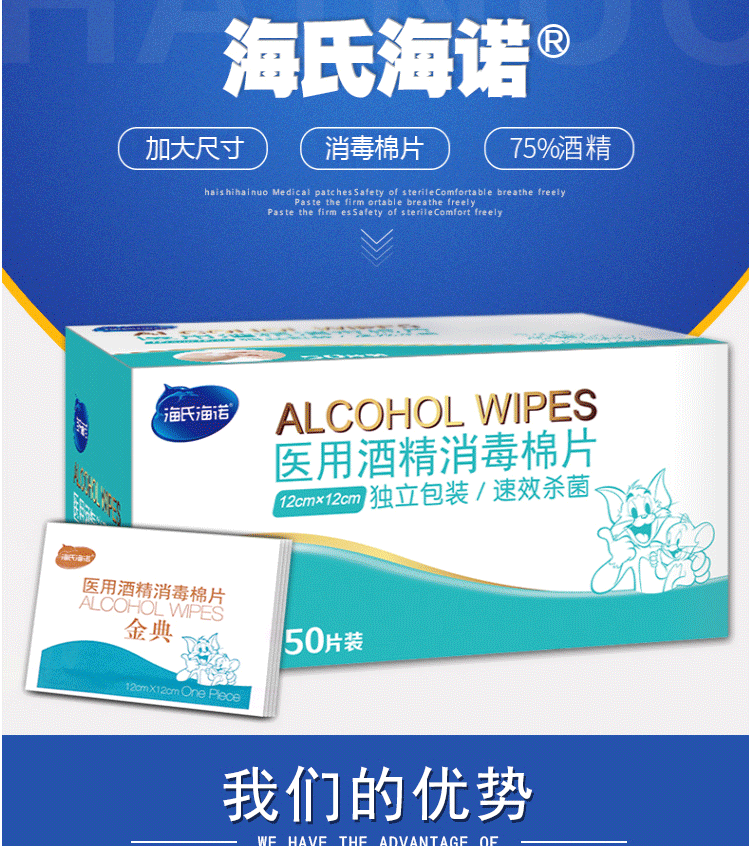 商品名称:海氏海诺 75%医用酒精棉片 大尺寸消毒湿巾50片装12cm*12cm 消毒棉片