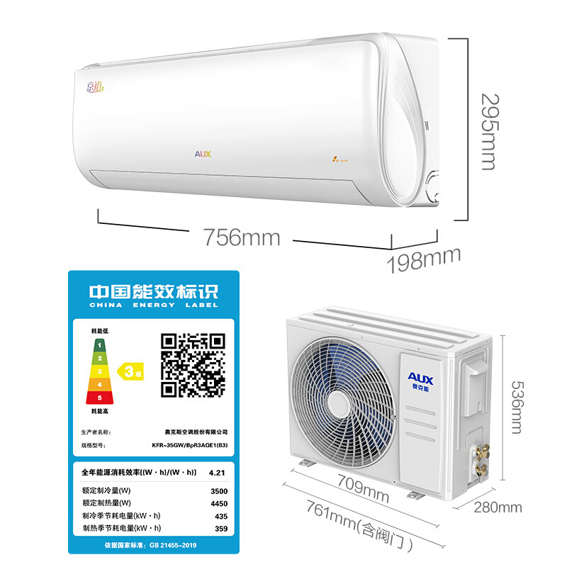 商品名称:奥克斯 (AUX) 1.5匹 新3级能效 易拆银离子滤网 变频冷暖 京裕Ⅱ空调挂机(KFR-35GW/BpR3AQE1(B3))