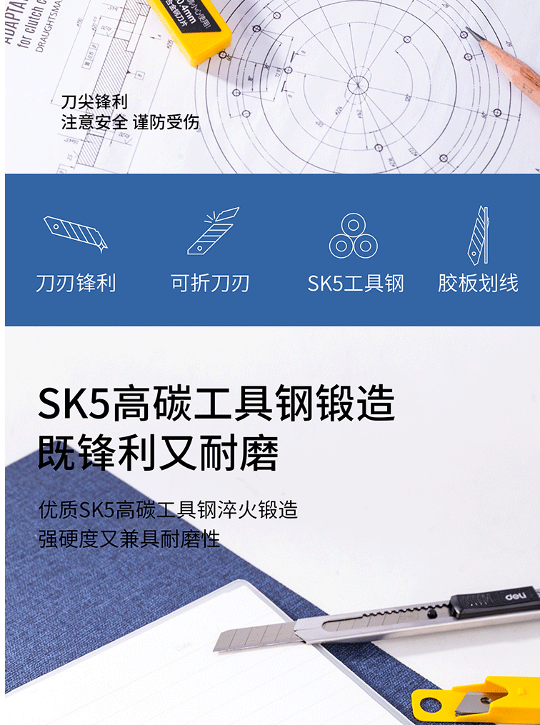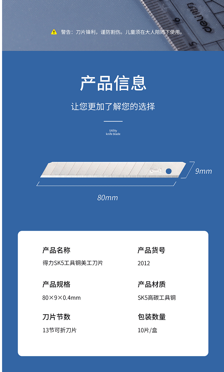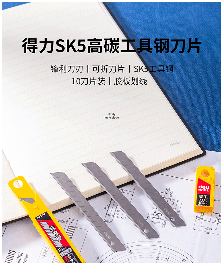 商品名称:得力(deli)13刀头SK5合金钢小号美工刀片/裁纸刀片 10片装 2012