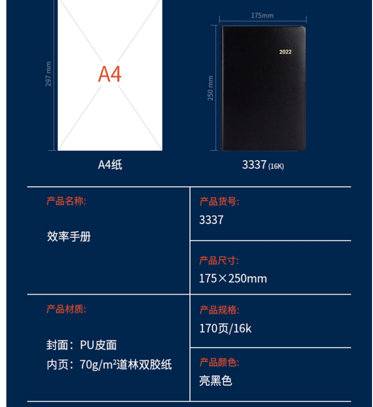 商品名称:得力/deli 效率手册170张 16K黑 效率管理笔记本 计划本 记事本3337