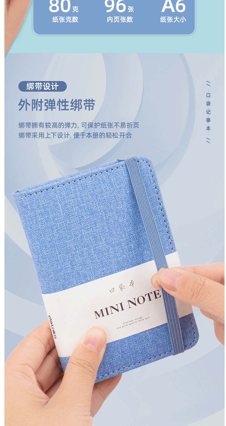 商品名称:得力(deli) A6/96张便携口袋本 笔记本 手账本 22234浅蓝