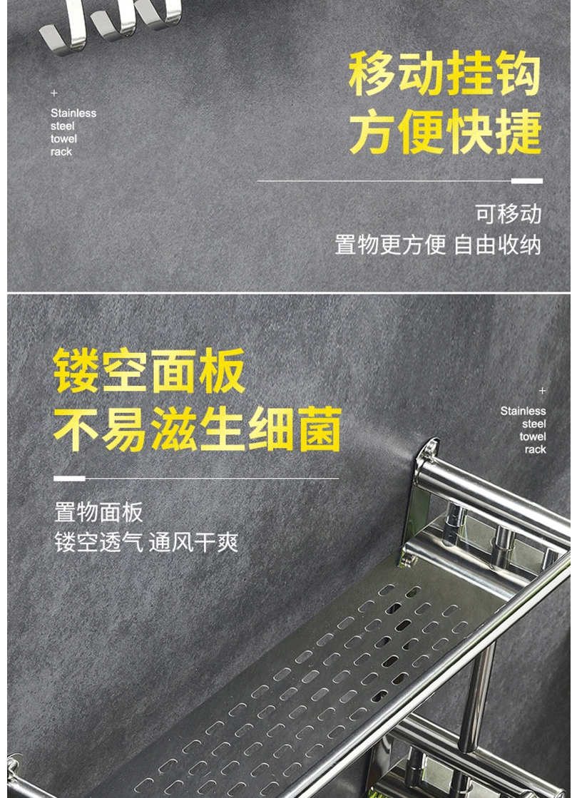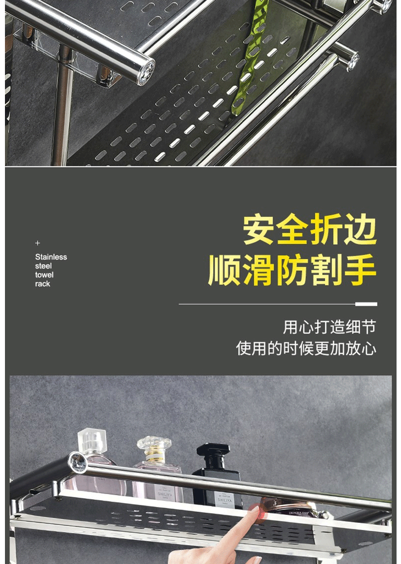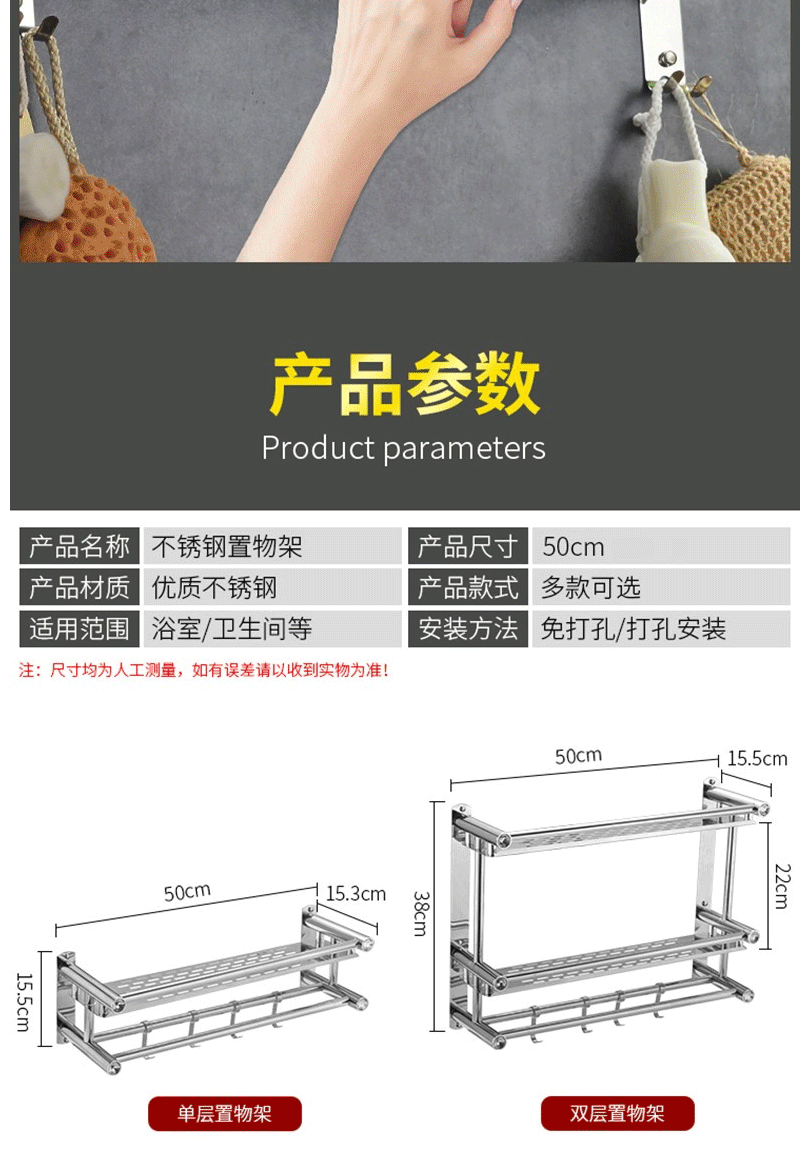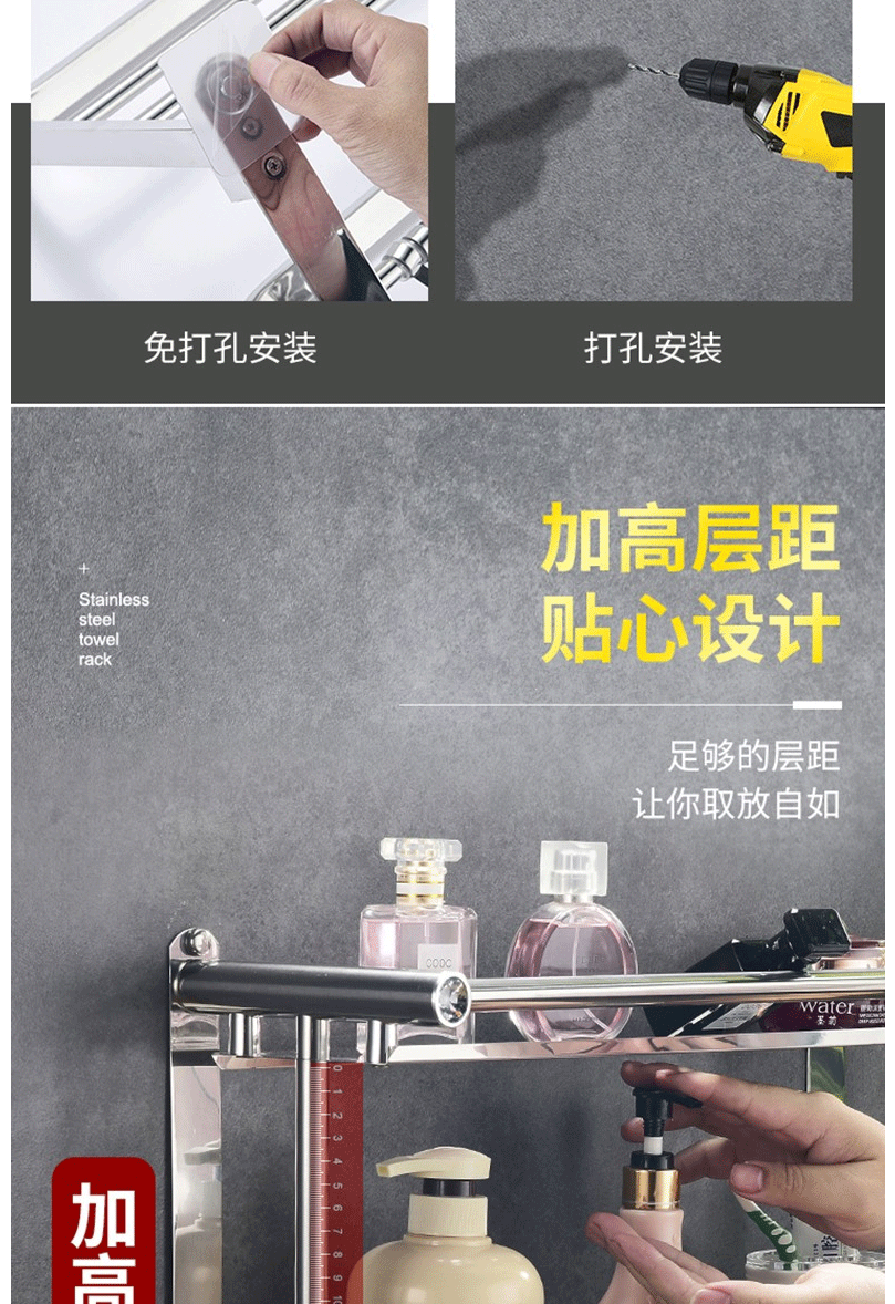 商品名称:卫生间置物架 毛巾架 不锈钢免打孔浴巾架 卫浴置物架双层50cm(免打孔/打孔两用)