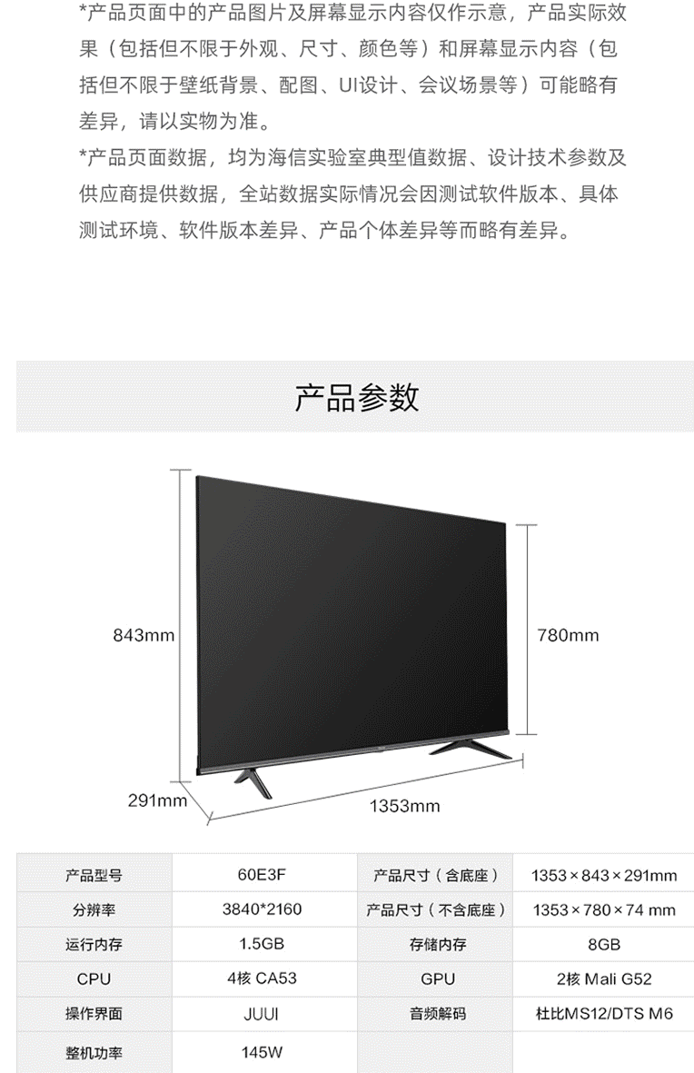 商品名称:海信(Hisense)60E3F 60英寸 4K超高清智慧语音 超薄悬浮全面屏彩电 电视机