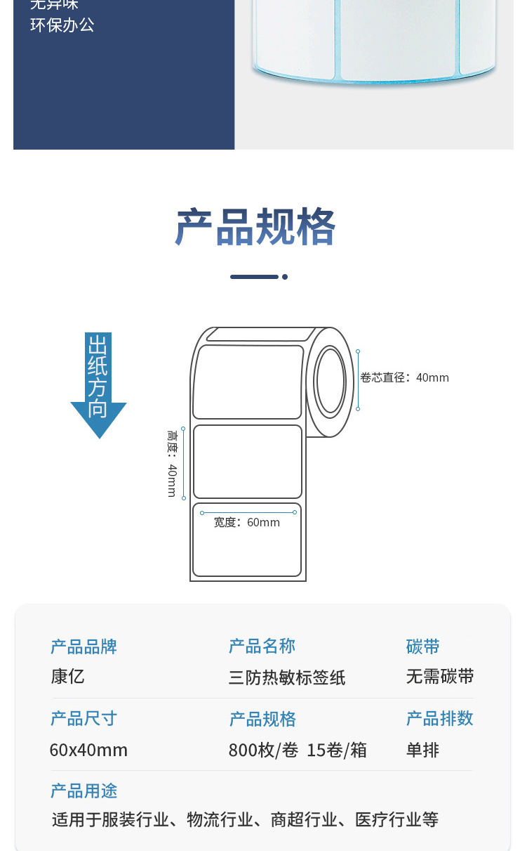 商品名称:康亿(KONYEE)三防热敏标签打印纸60×40mm 15卷(800枚/卷)