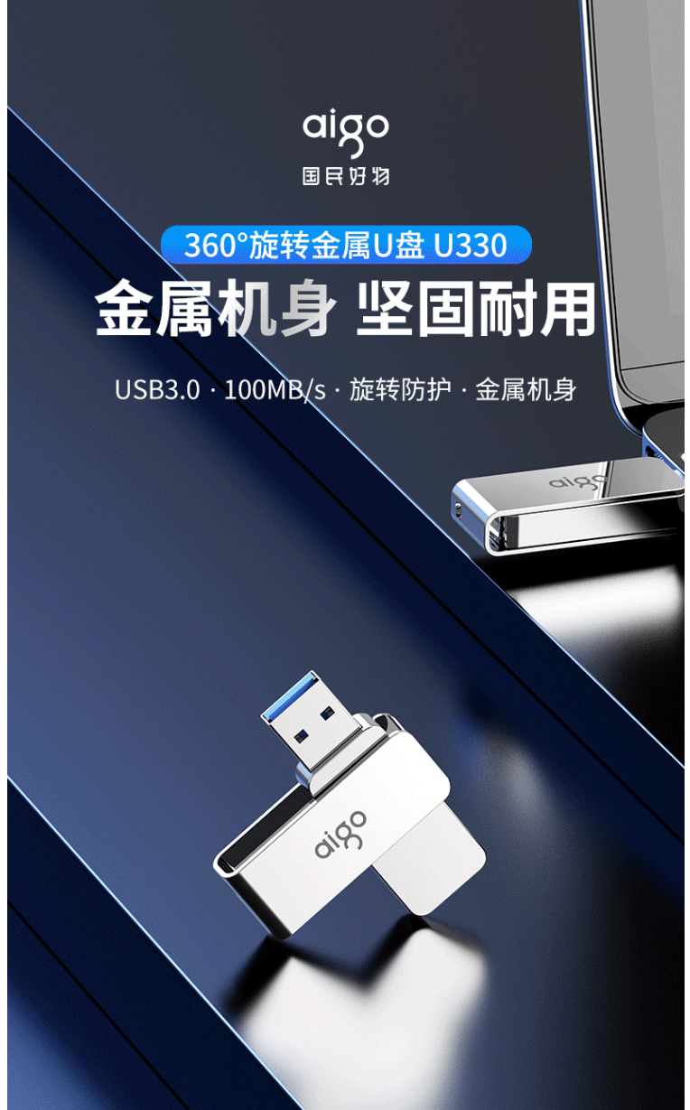 爱国者(aigo)64GB USB3.0 U盘 U330金属旋转系列 银色